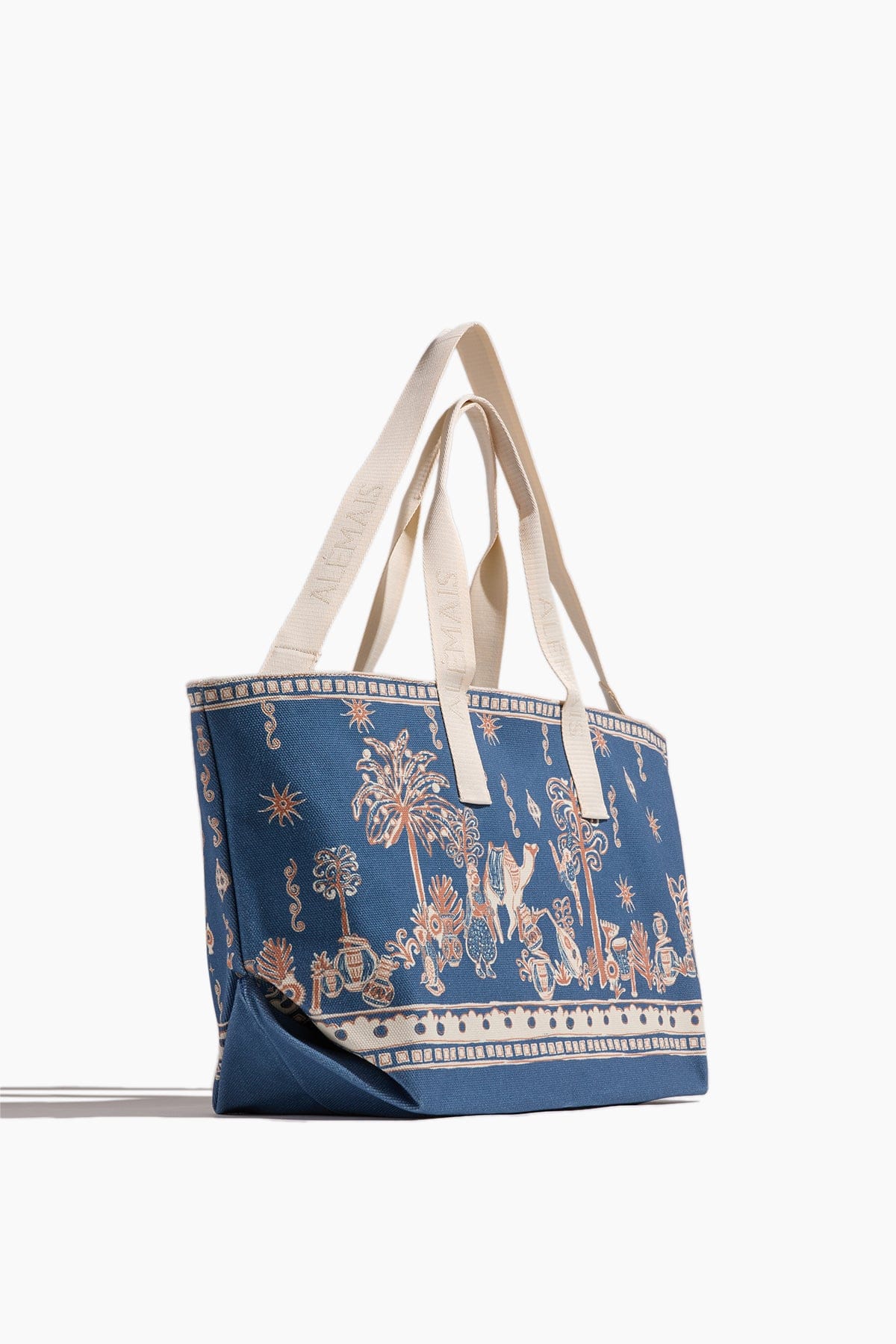 The Alemais Acacia Weekender in Blue is a printed cotton canvas weekender bag with shoulder straps and top zip closure.