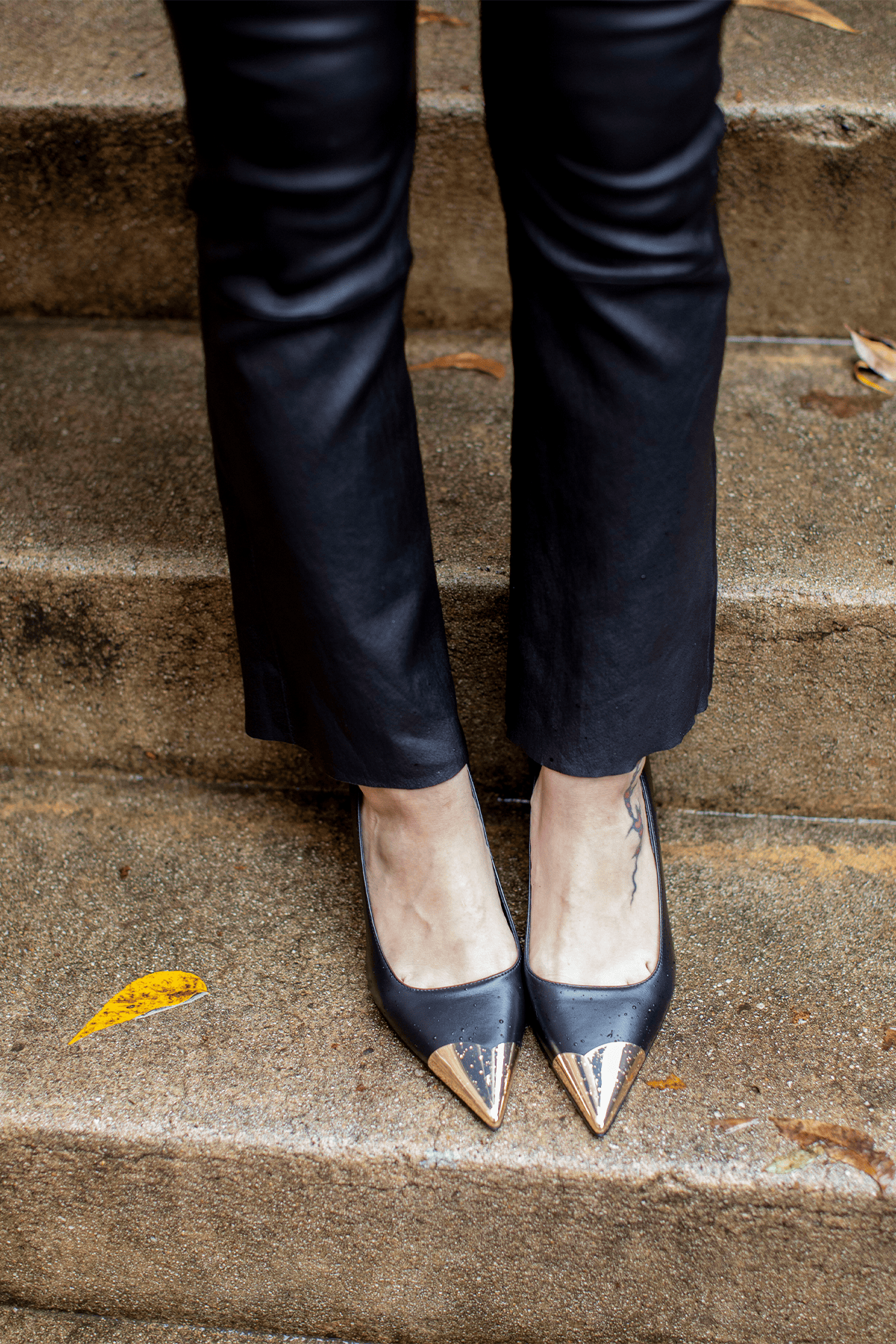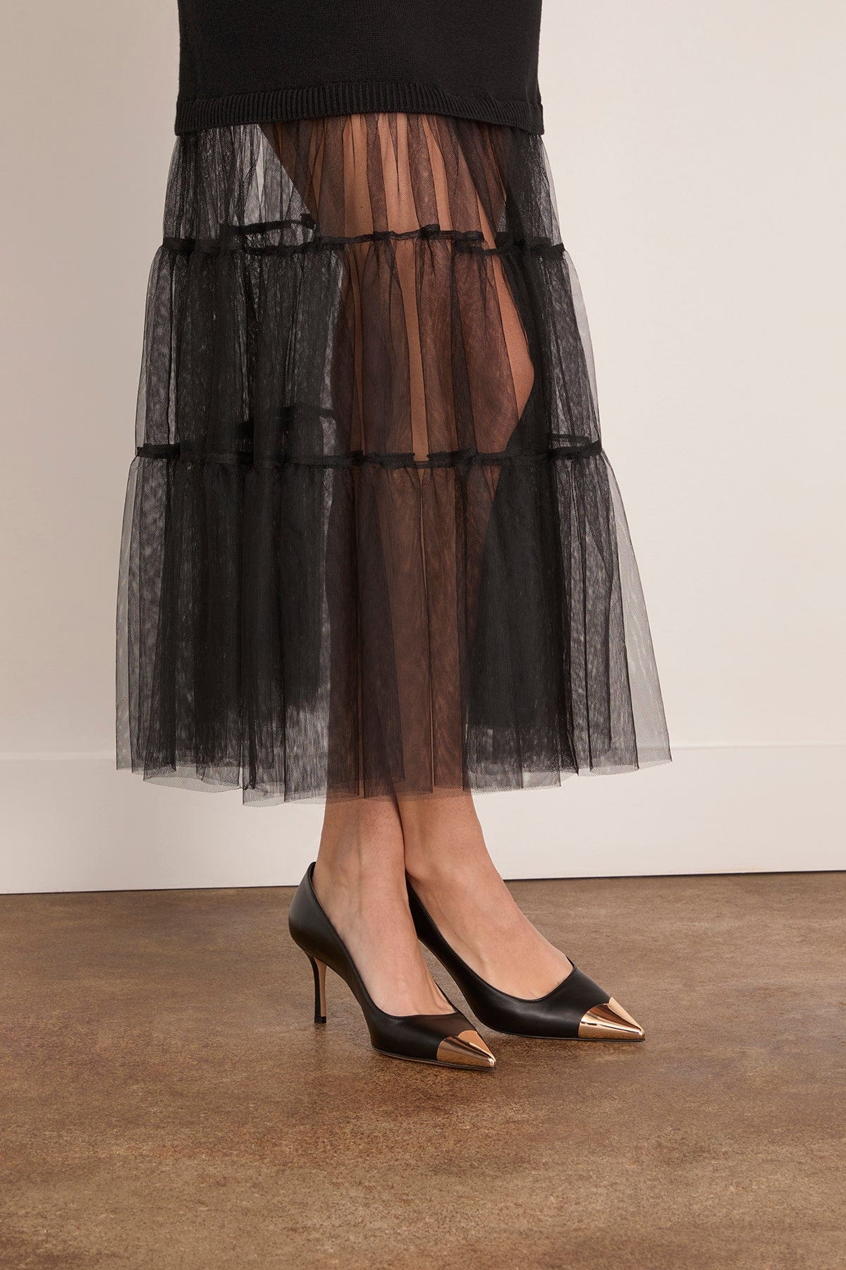 The Marion Parke Ava Pump in Black is a classic pump crafted in soft nappa leather and accented with a gold-tipped toe for a modern, polished edge. Featuring a 2.75" (70mm) heel and Marion Parke's twice-patented invisible insole for lasting comfort. Meticulously handcrafted in Italy.
