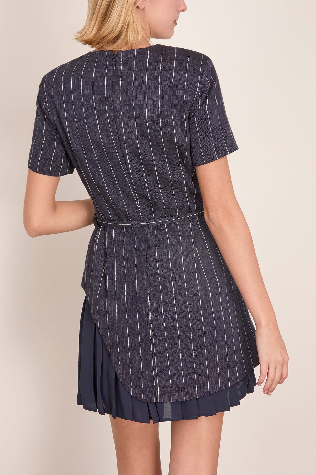 The Simkhai Blakely Short Sleeve Mini Dress is perfect for the office. This mini dress is crafted in a pinstripe material with a flattering belted waistline and tailored silhouette. Wear yours with boots and a tote bag.