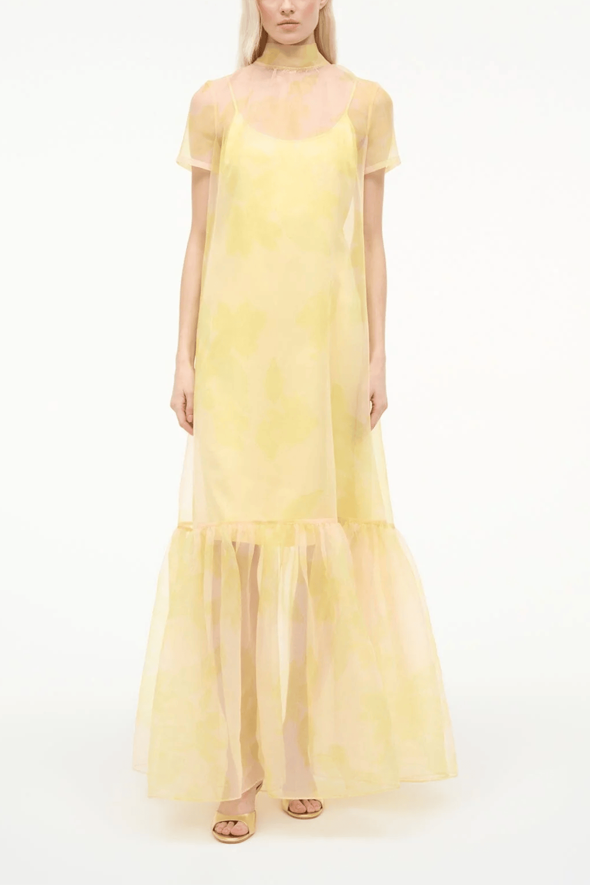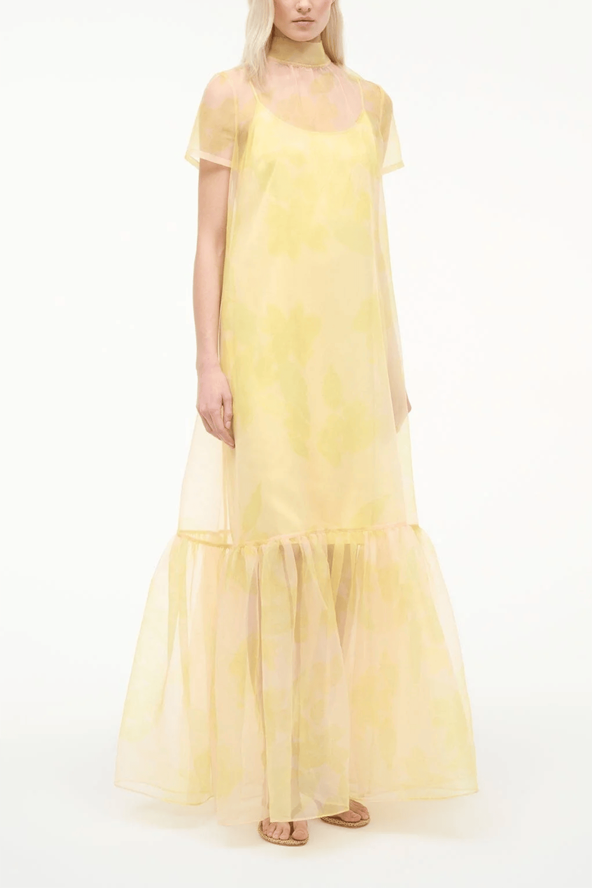 The Staud Calluna Dress features their signature silhouette. You'll love the flowing organza overlay of this maxi dress with a ruffled hemline in a yellow print for spring and summer. Wear yours with heels and a clutch.