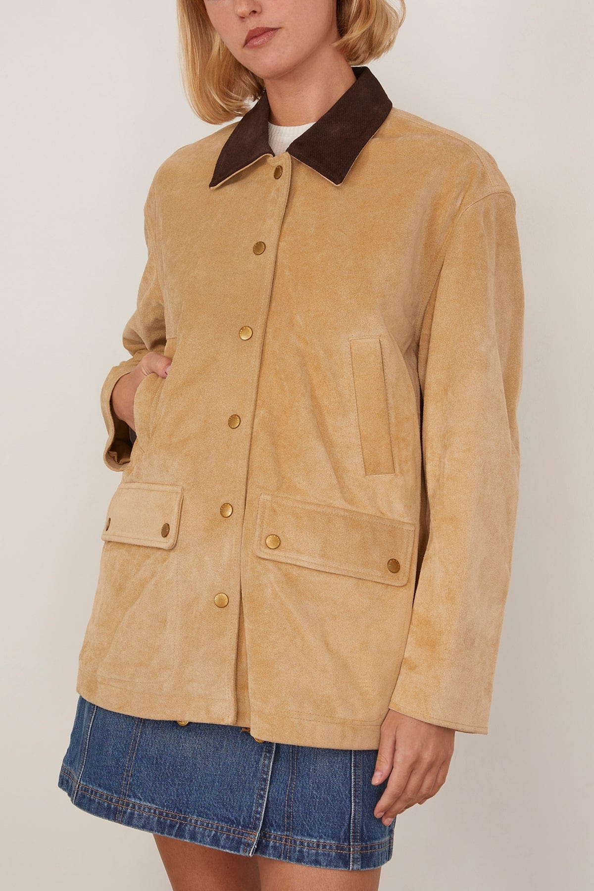 The Rag and Bone Cassidy Suede Jacket is an on-trend addition to your wardrobe. This barn jacket is crafted in supple suede with an oversized fit and contrasting collar. Wear yours over a sweater with jeans.