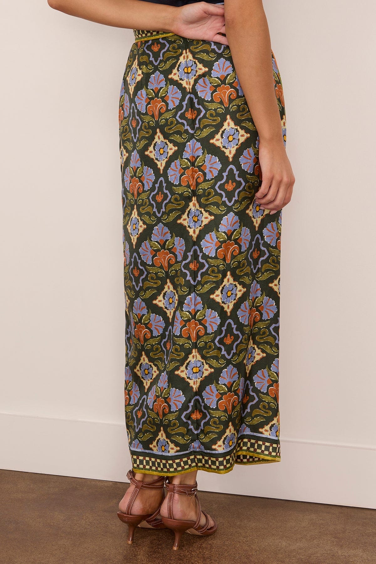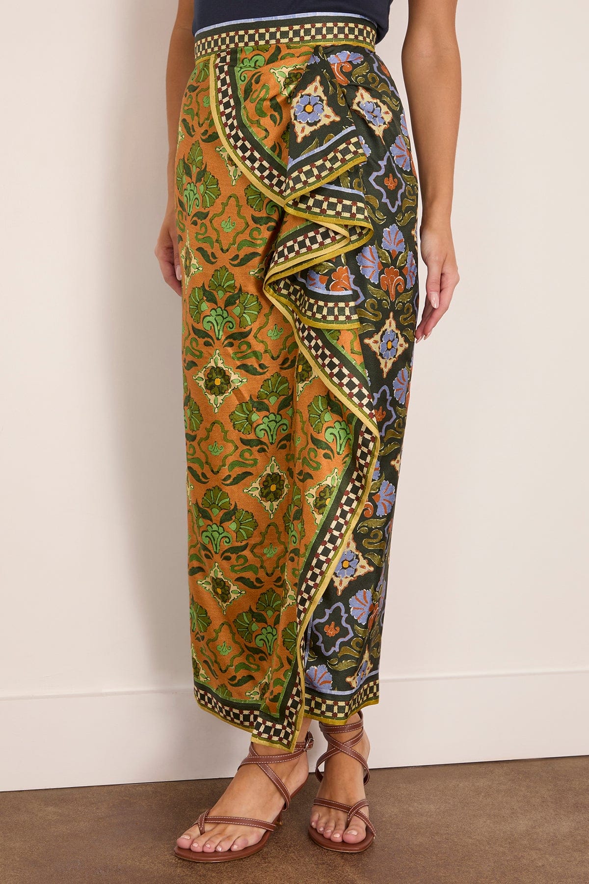 The Alemais Cece Spliced Silk Skirt in Multi is a midi skirt with draped ruffle detail.