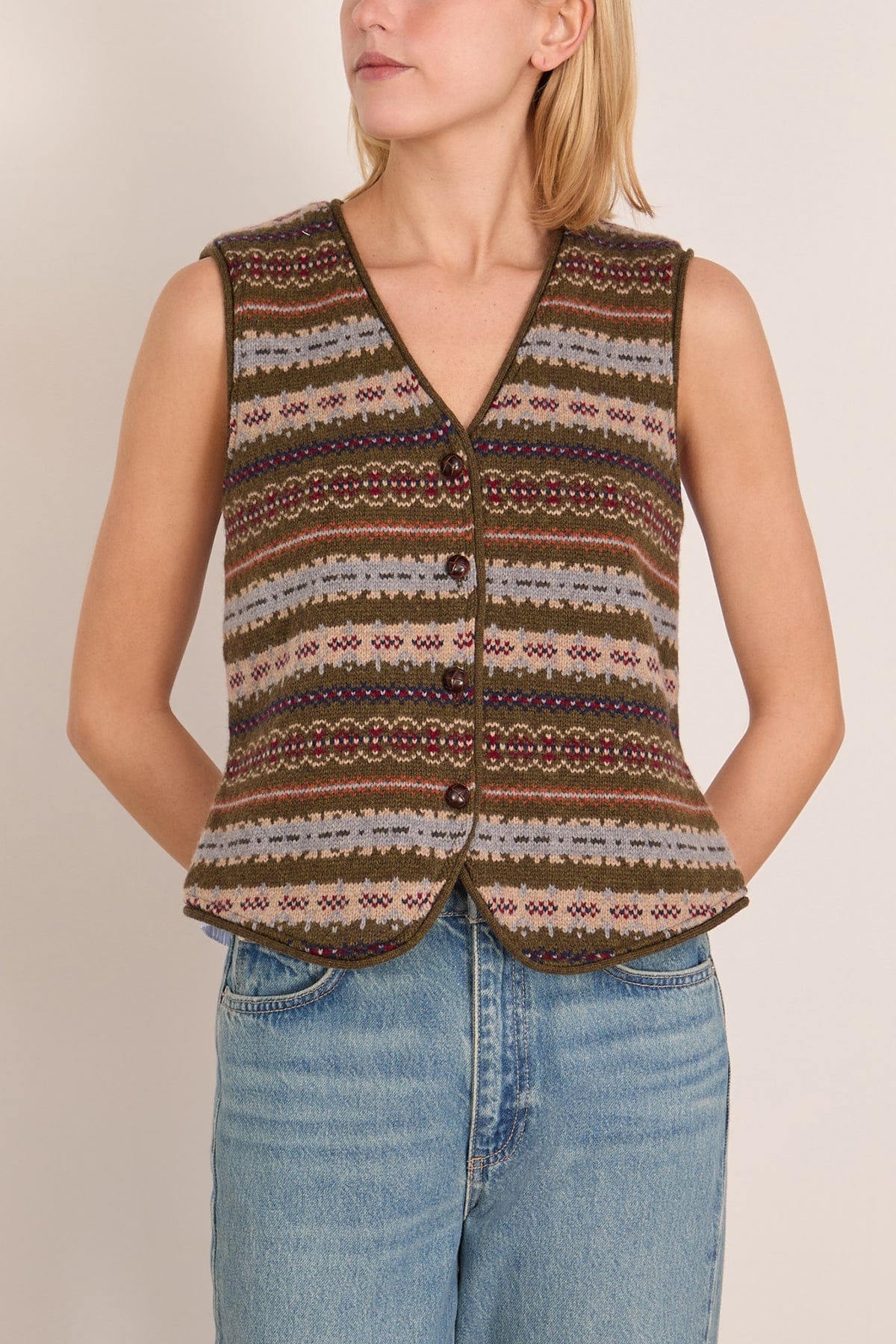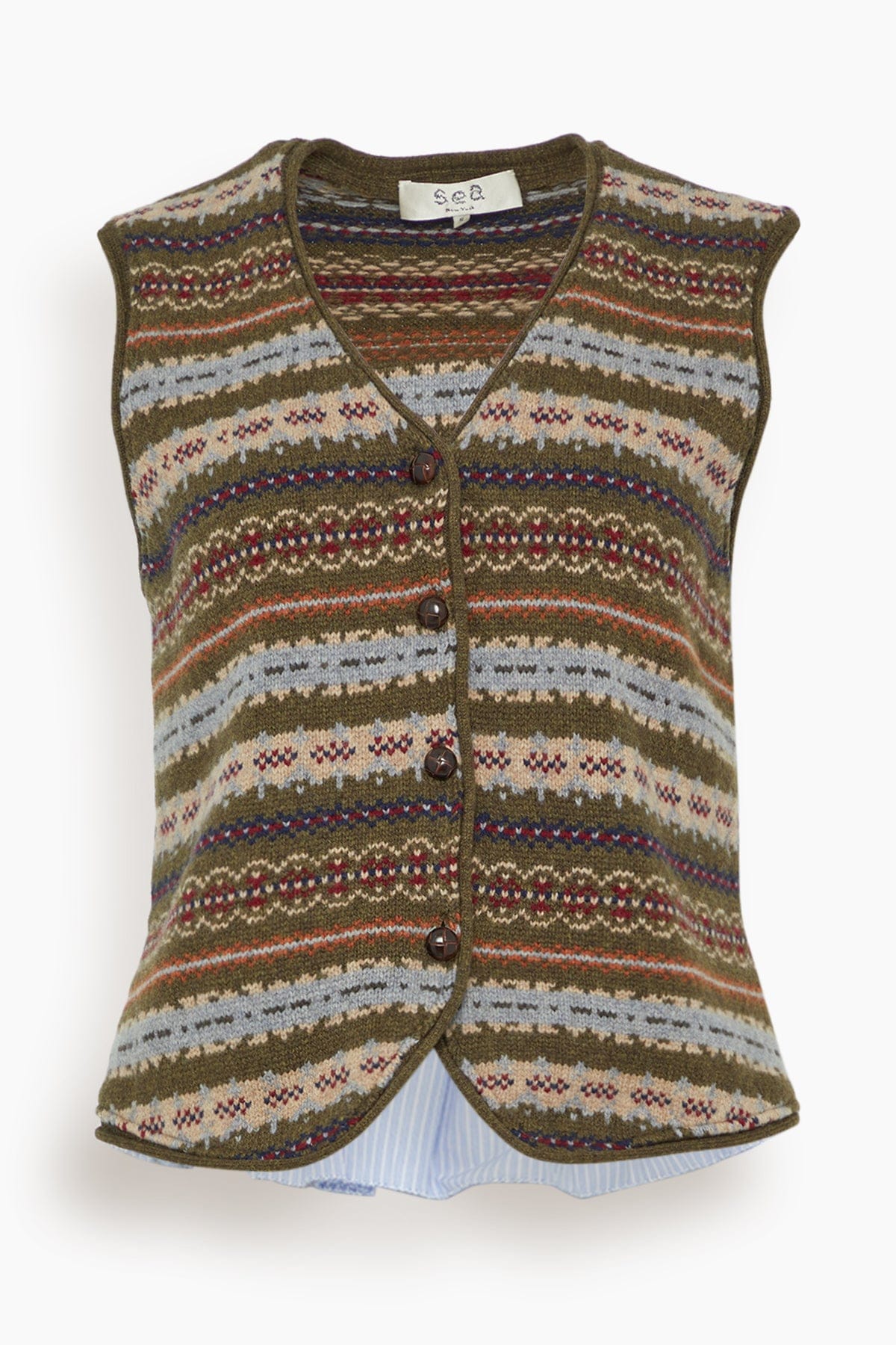 The SEA Ciara Fair Isle Knit Combo Vest features the unique details you love from this designer. This vest has a knit fair isle front with a striped cotton poplin back. Wear yours with jeans and flats.