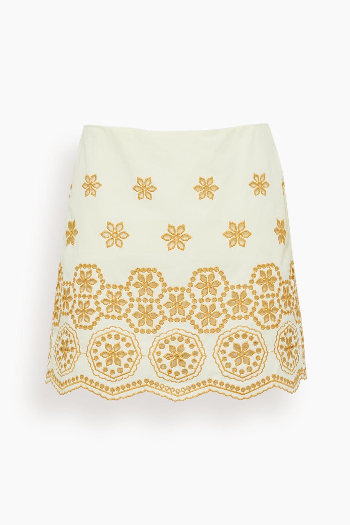 The Tanya Taylor Clarisse Skirt is a must-have addition to your summer wardrobe. This mini skirt features eyelet embroidery with a scalloped hemline. Wear yours with a blouse and sandals.