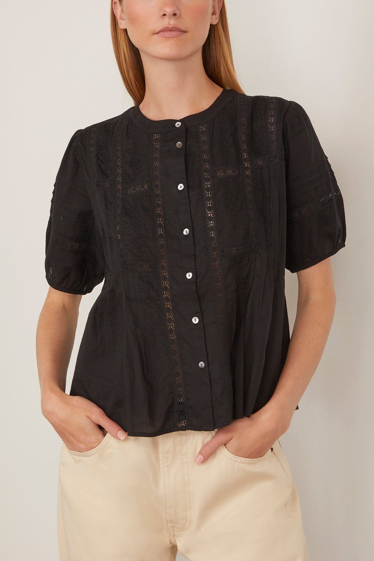 The Xirena Claudia Shirt is a must-have piece from their PreFall 25 Collection. This button down shirt features a relaxed fit with floral embroidery and a lace trim. Wear yours with jeans and flats.