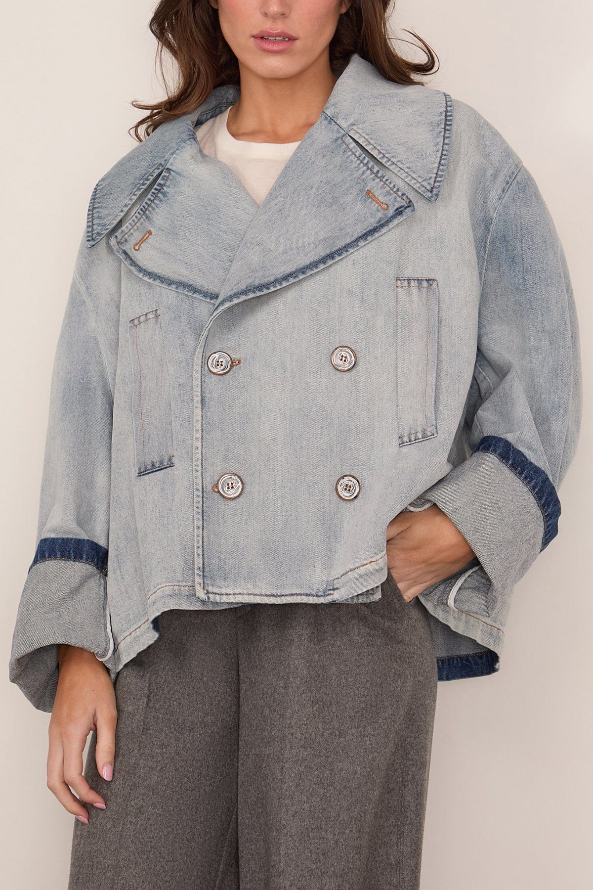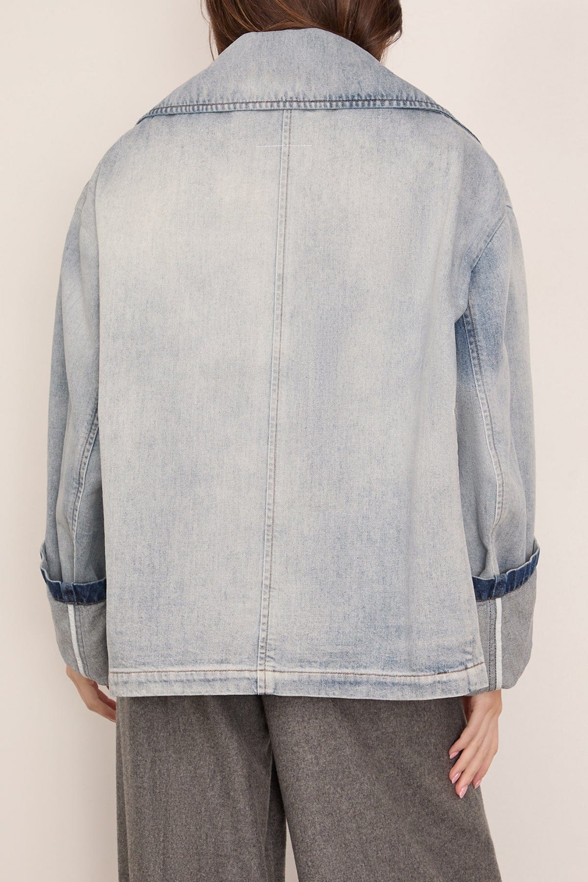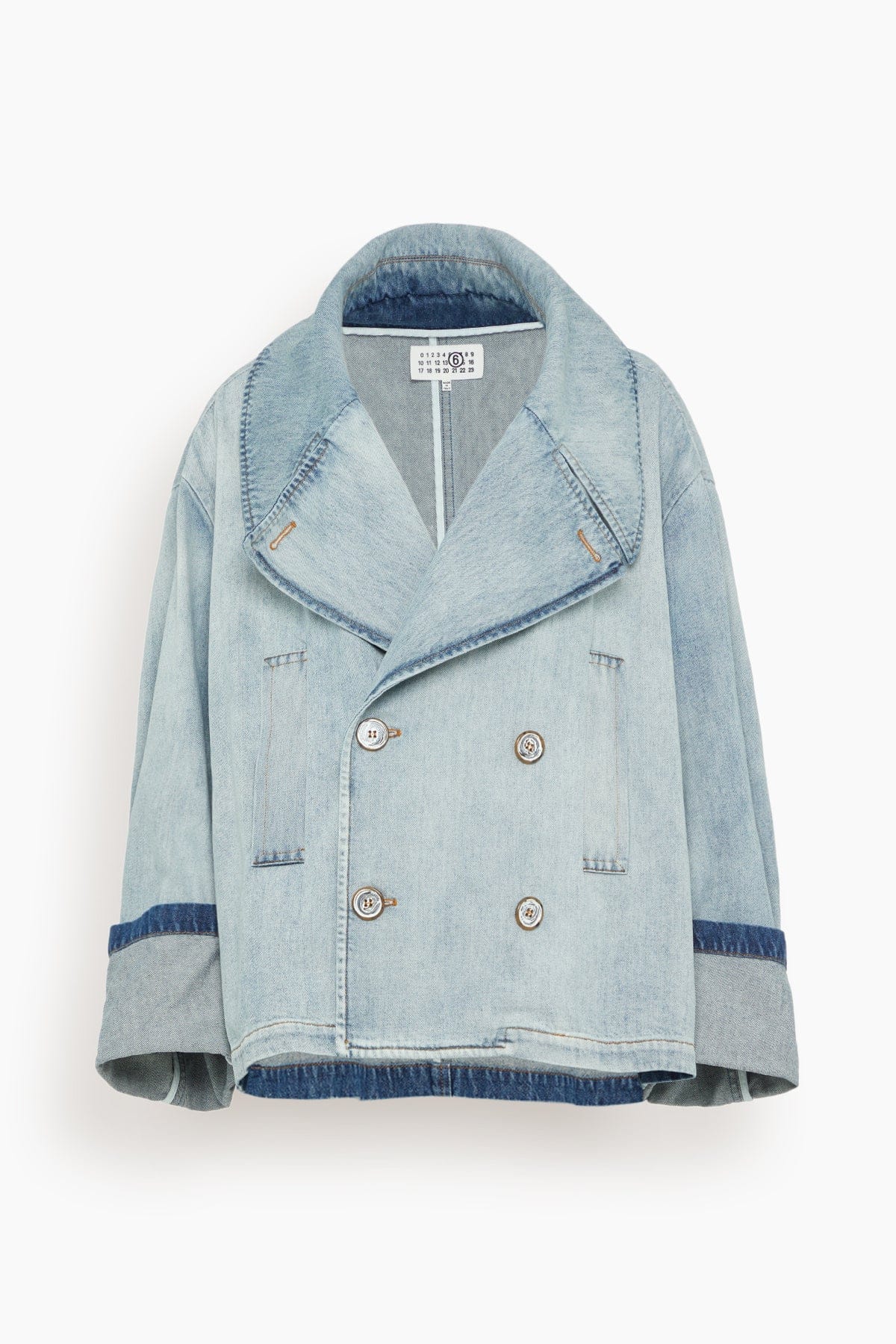 The MM6 Maison Margiela Denim Peacoat in Light Blue distorts uniform codes with wide lapels and tobacco stitching. The light wash and turned-up cuffs soften the form, while the squared construction draws from the Martin Margiela archive, introducing new attitude and functionality to a familiar shape. Finished with MM6’s horizontal white stitch line at the back.