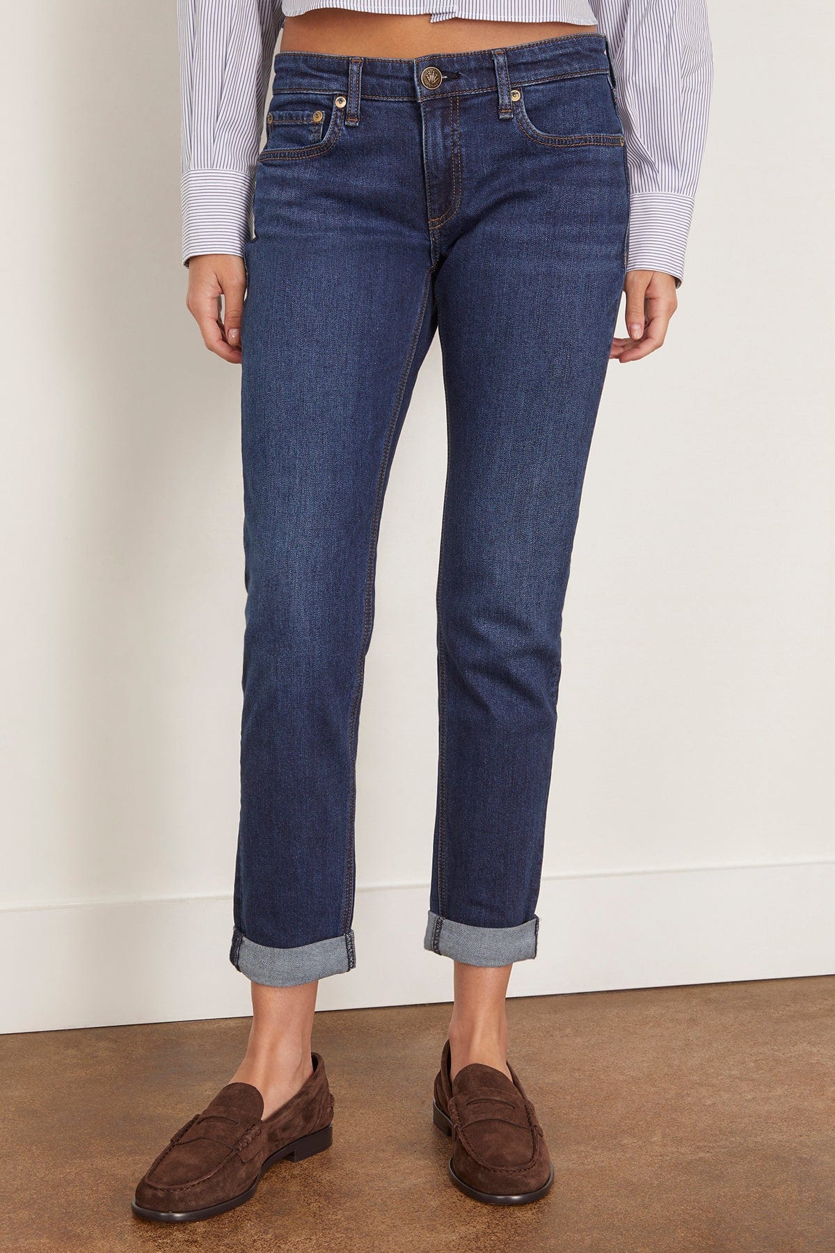 The Rag and Bone Dre Low Rise Slim Boyfriend Jean is crafted in their signature stretch denim. You'll love the slim leg and flattering high rise of these jeans in a dark wash. Wear yours with a sweater and boots.