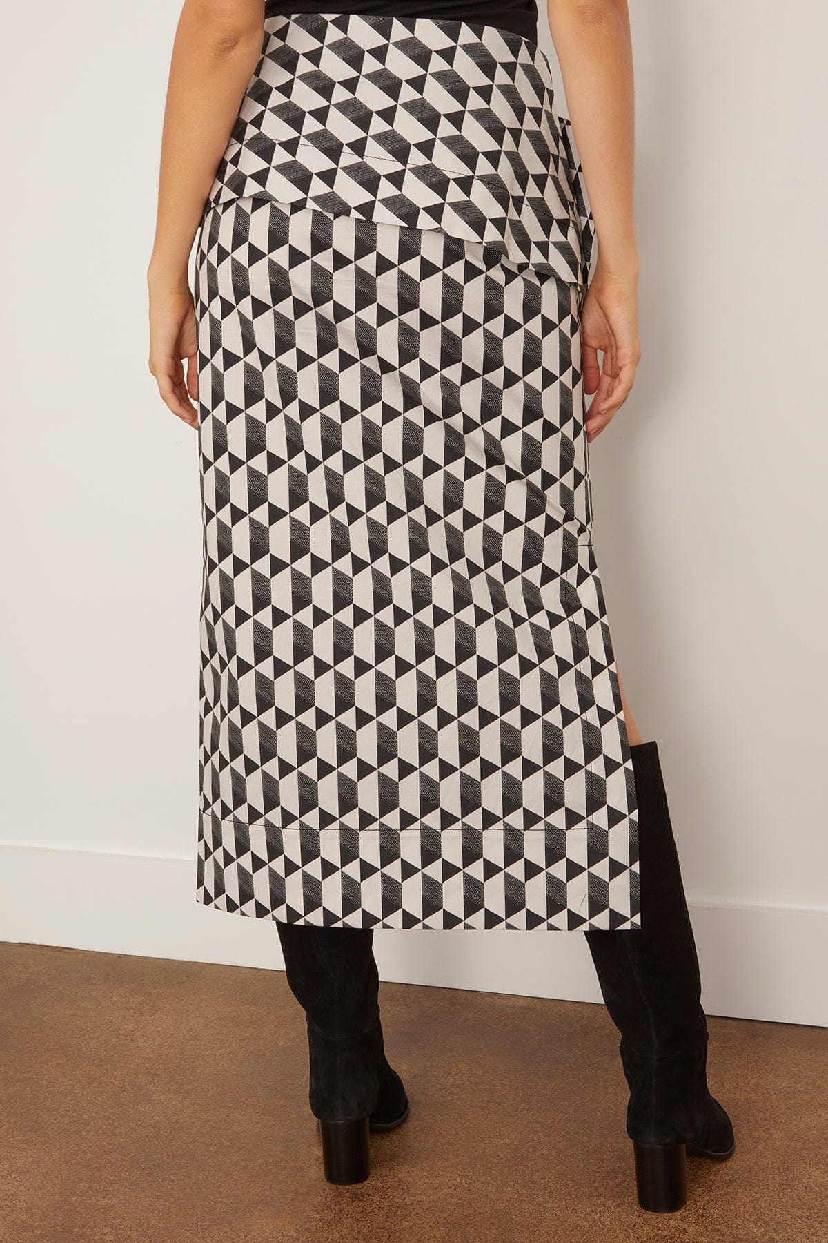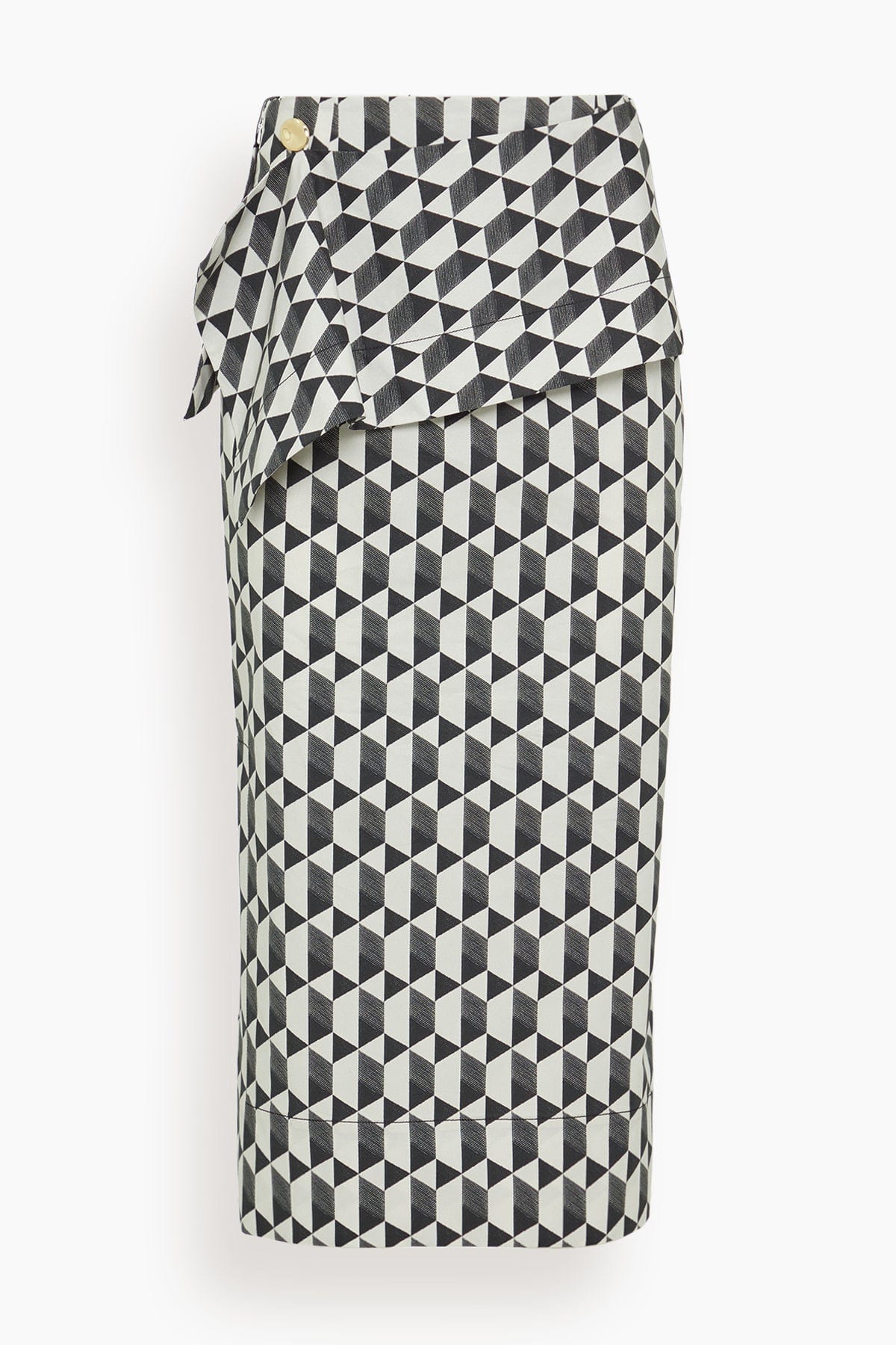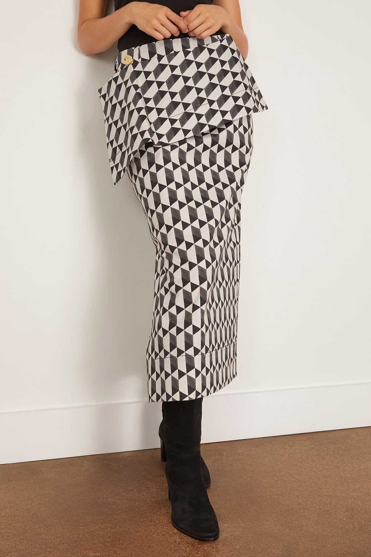 The Amir Taghi Eloise Skirt in Ecru and Black is an asymmetric peplum skirt in geometric stretch cotton poplin.