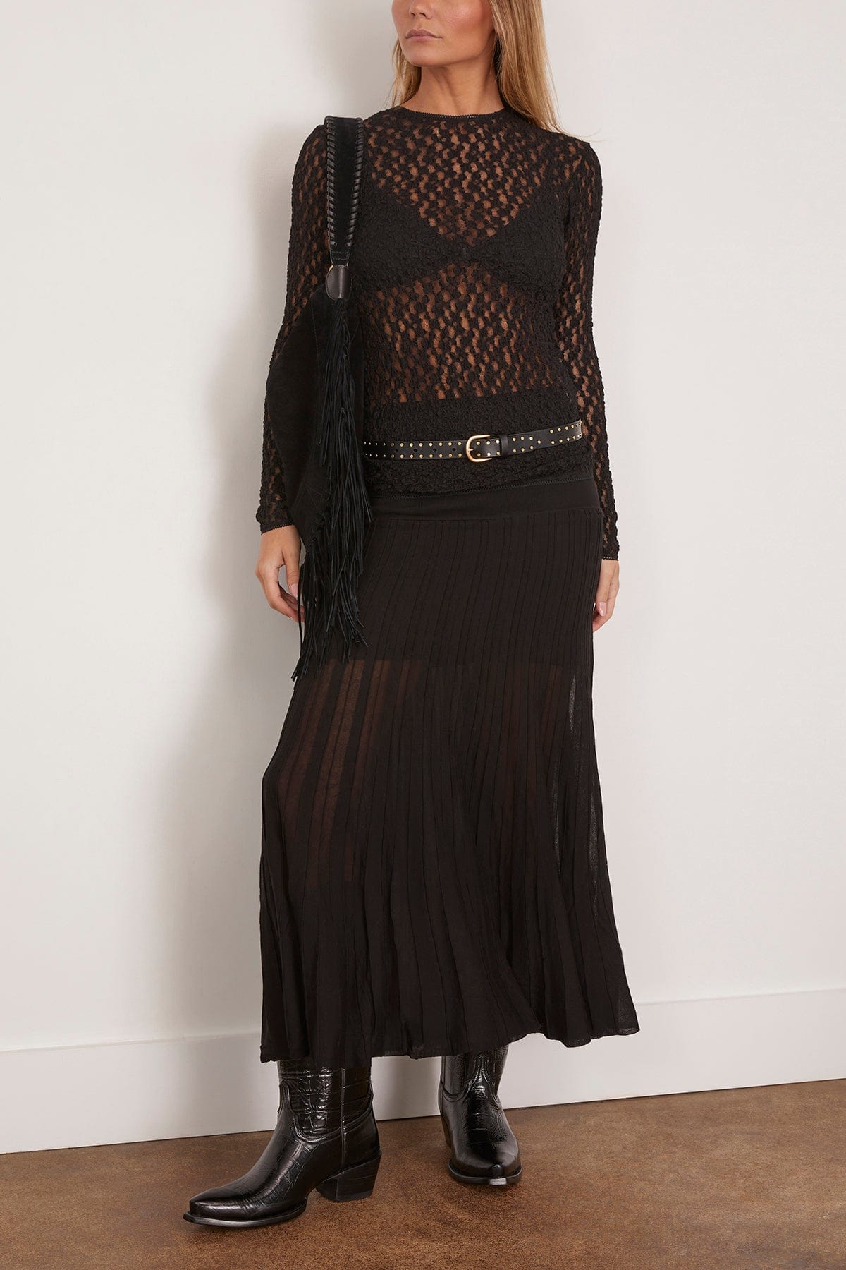 The Isabel Marant Ezra Skirt features the bohemian flare you love from this designer. This maxi skirt features a flowing silhouette with pleating and a semi-sheer finish. Wear yours with a sweater and boots.