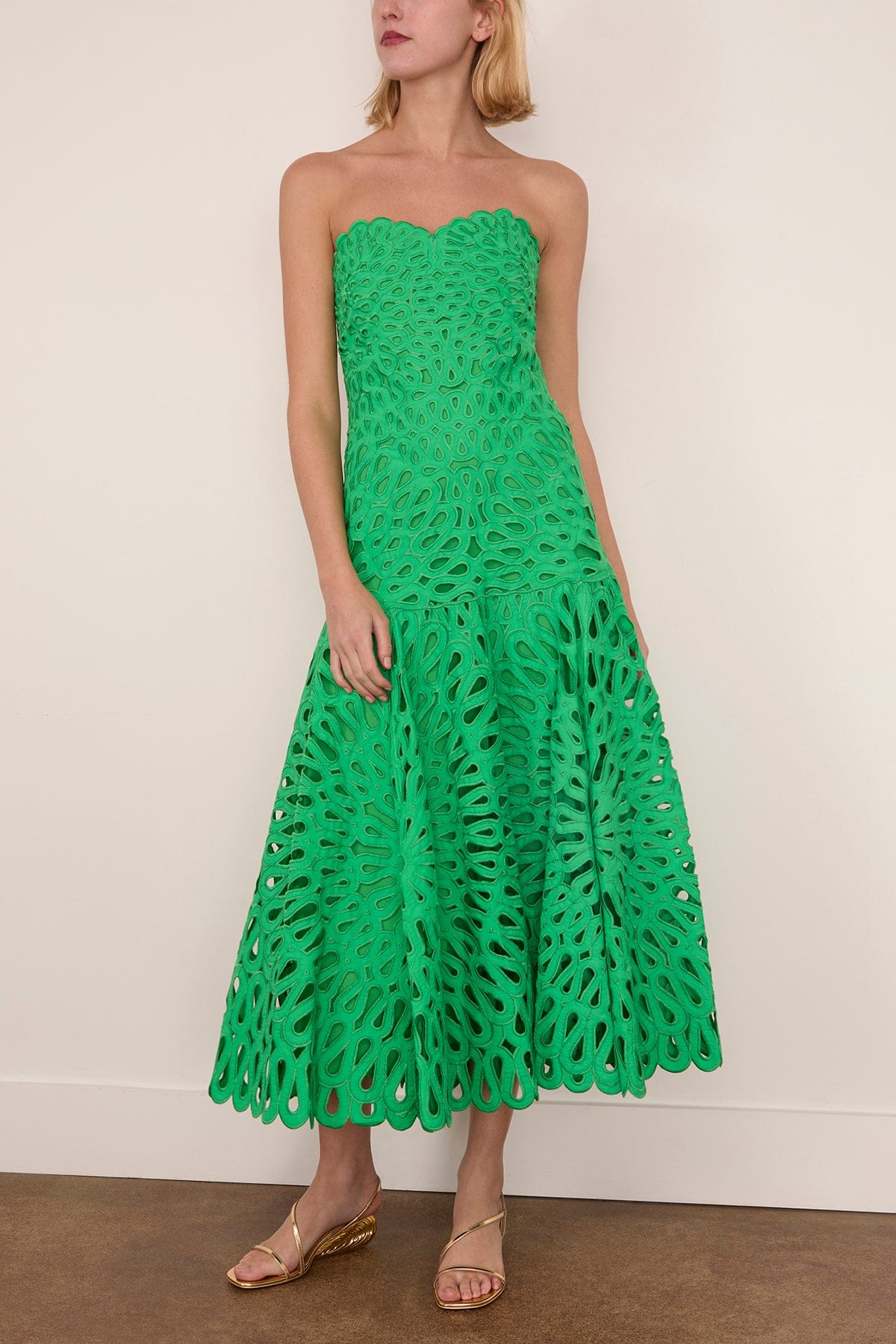 The Simkhai Florence Midi Dress is perfect for a vacation or evening out. This strapless dress is crafted in beautiful engineered embroidered lace with a flared skirt. Wear yours with heels and a clutch.