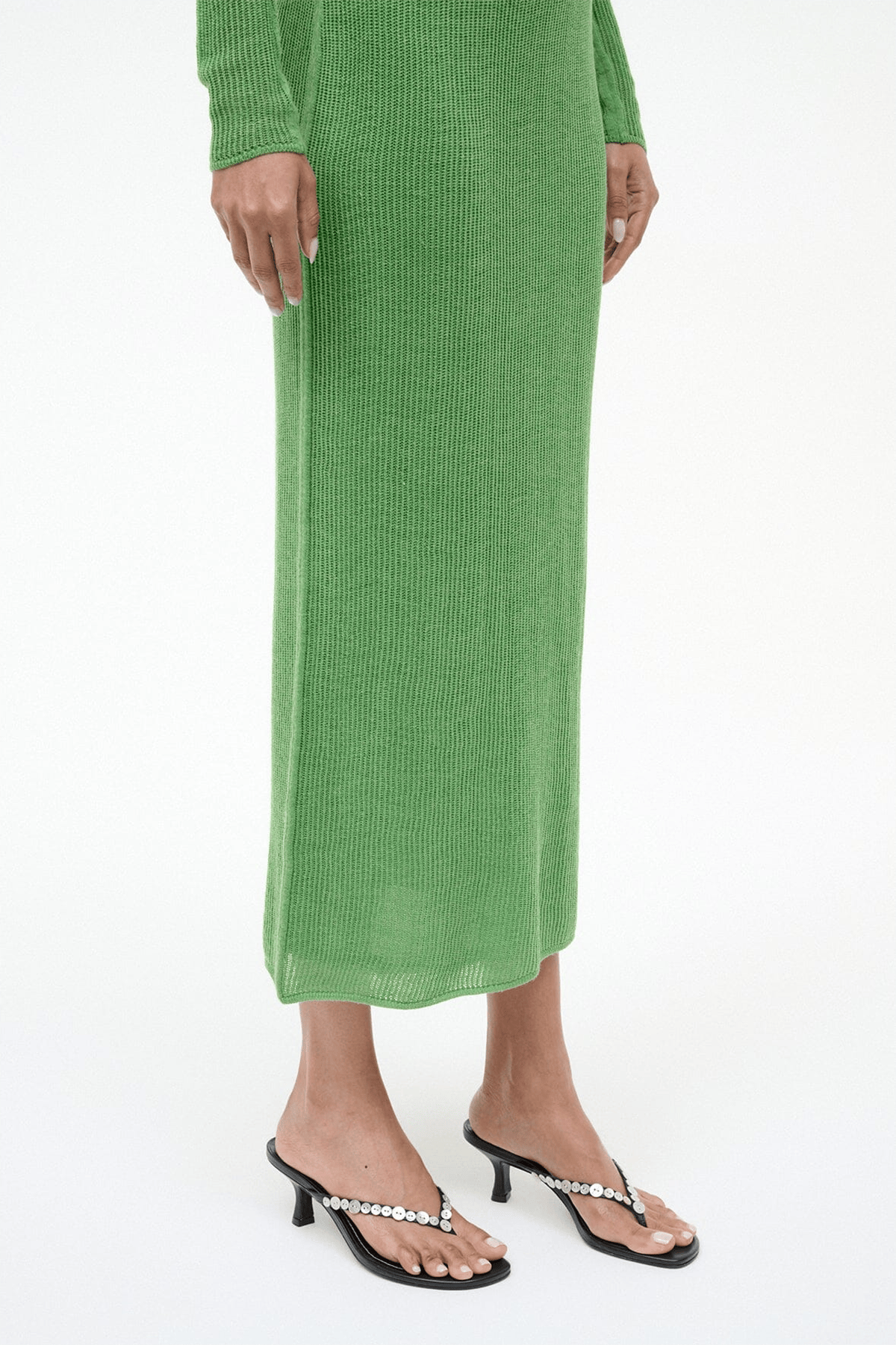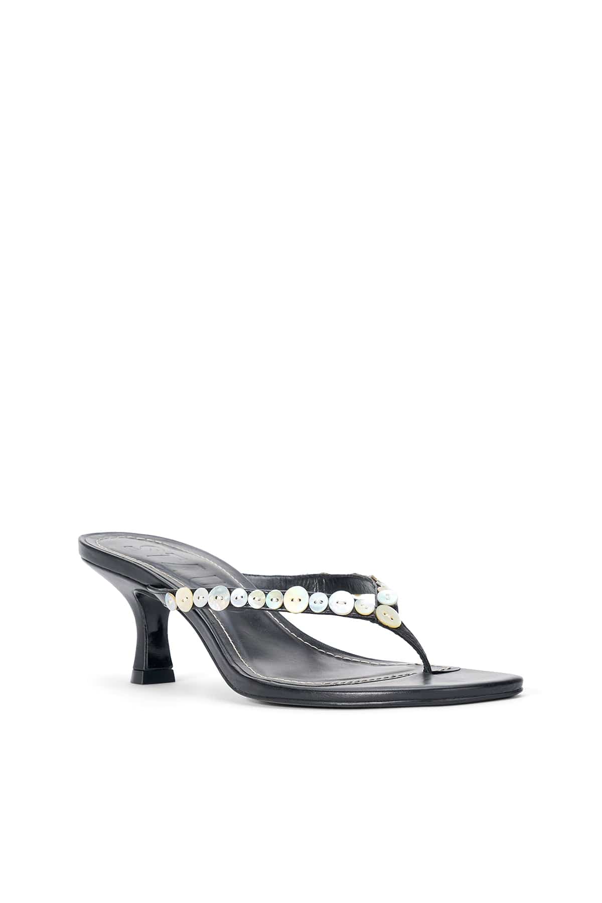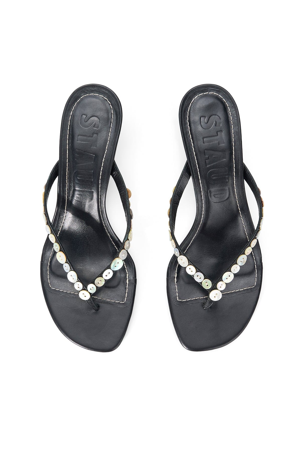 The Staud Freja Thong Kitten Heel are a classic with a twist. These thong sandals feature a kitten heel with mother of pearl buttons along the strap.