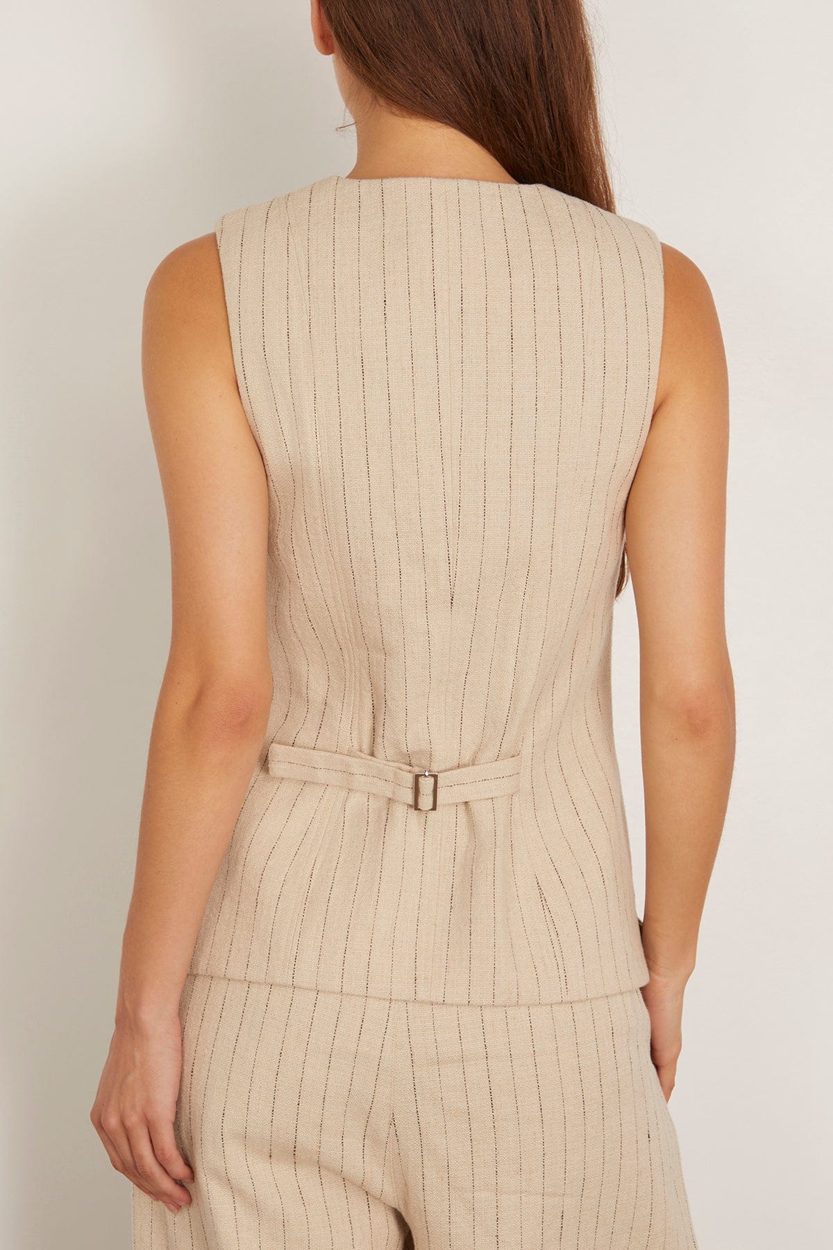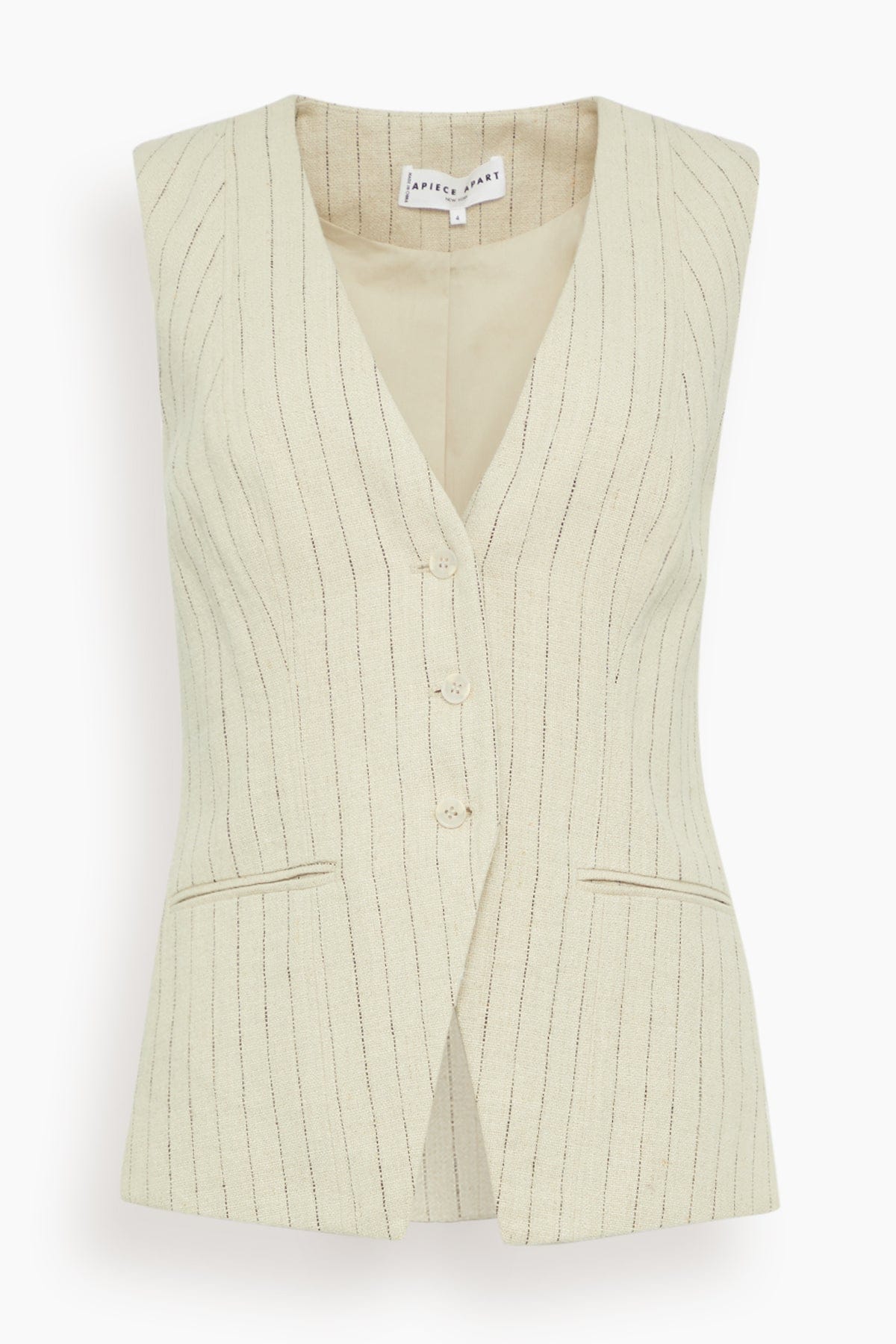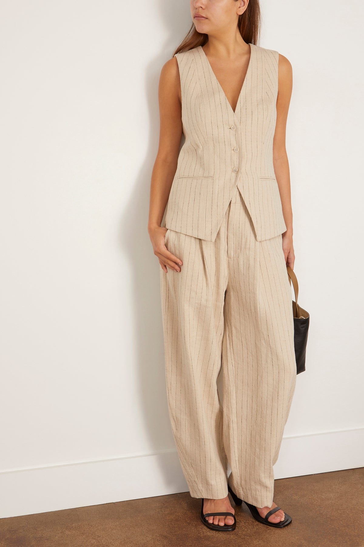 The Apiece Apart Helena V-Neck Vest in Striped Flax is a classic suiting vest designed with a modern, flattering fit. We love pairing the Helena with the matching Bari Crop Trousers.