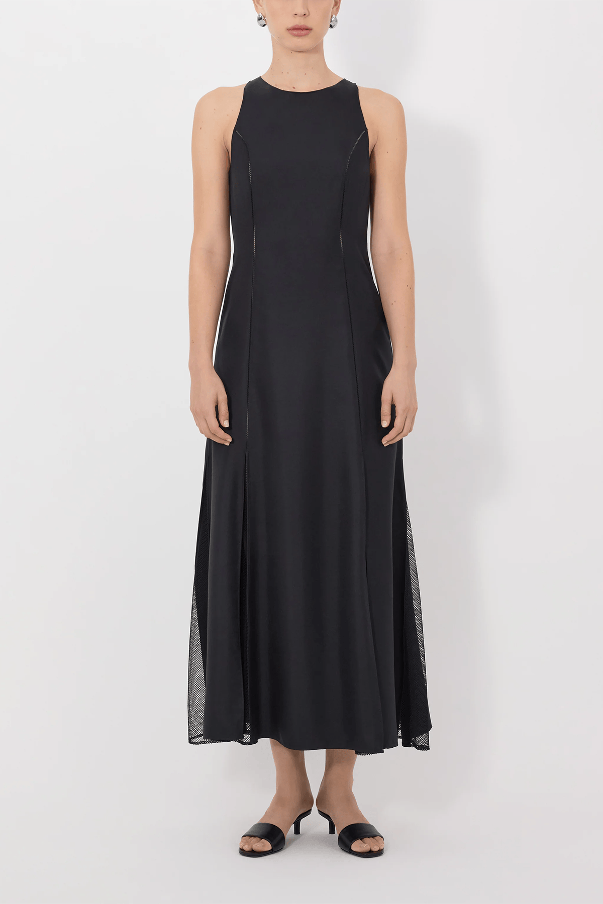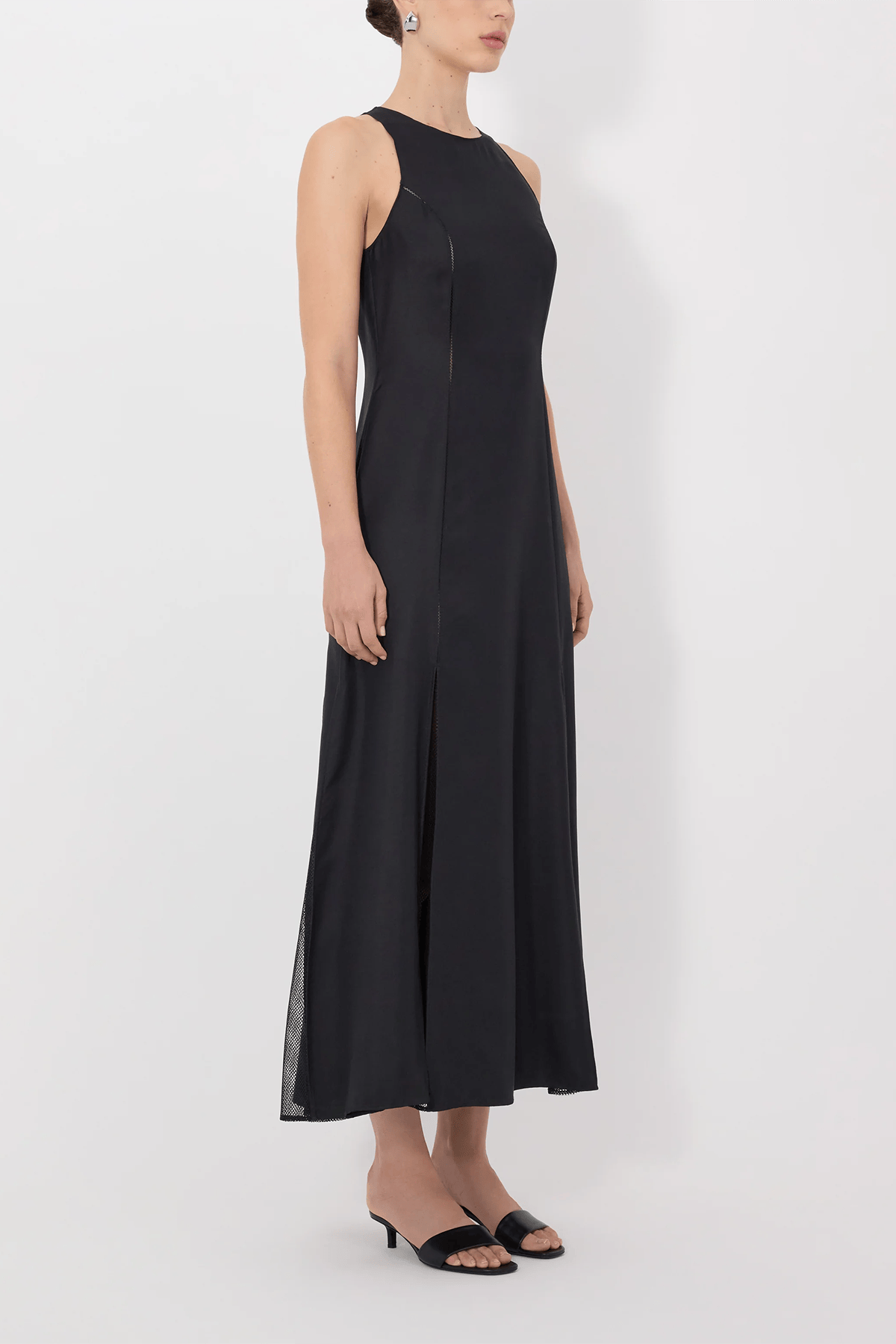 The Loulou de Saison Iraka Detailed Maxi Dress is a must-have piece from their Spring 26 Collection. This dress is crafted in a lightweight silk with a beautiful flares skirt and mesh panels. Wear yours with sandals and a tote bag.