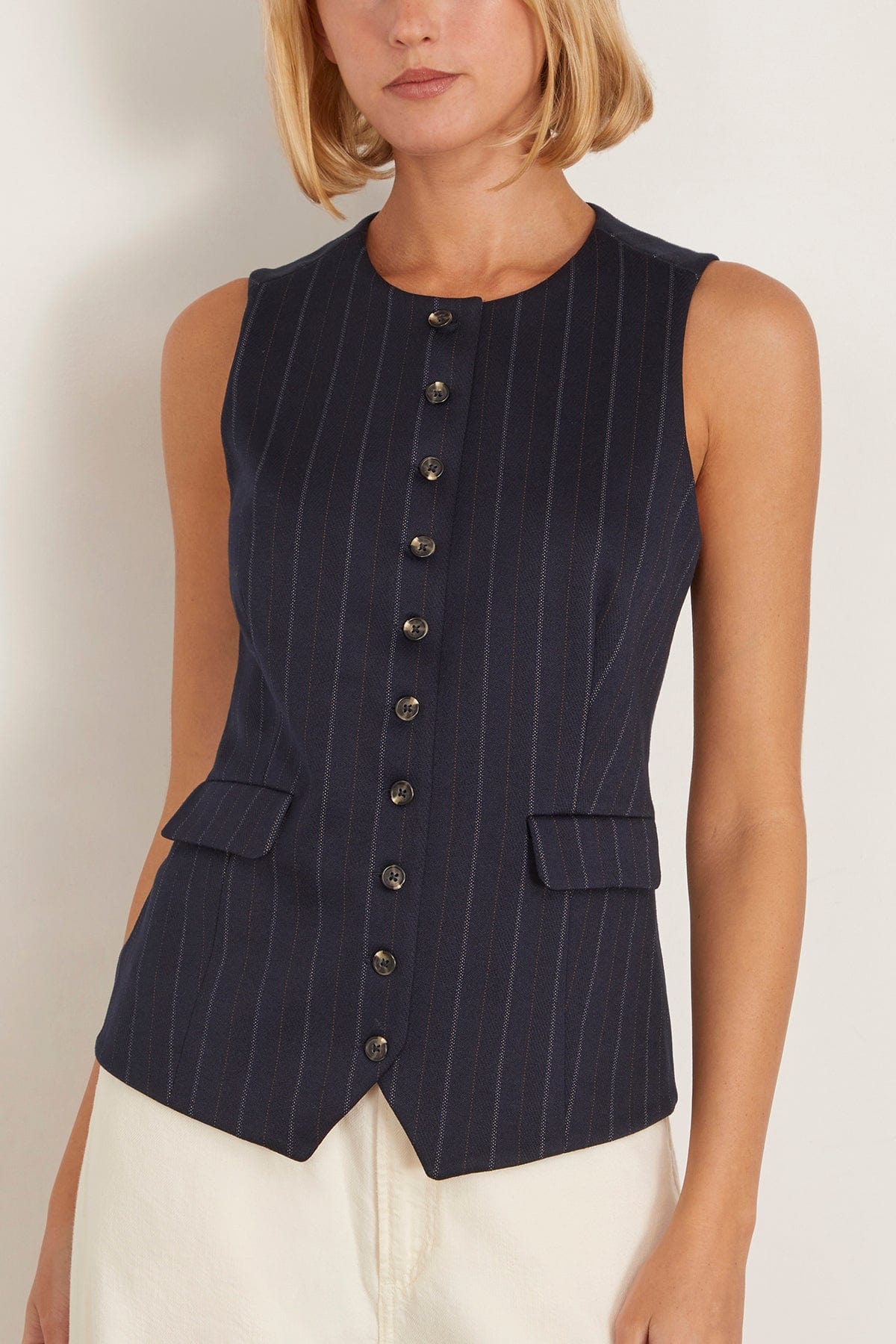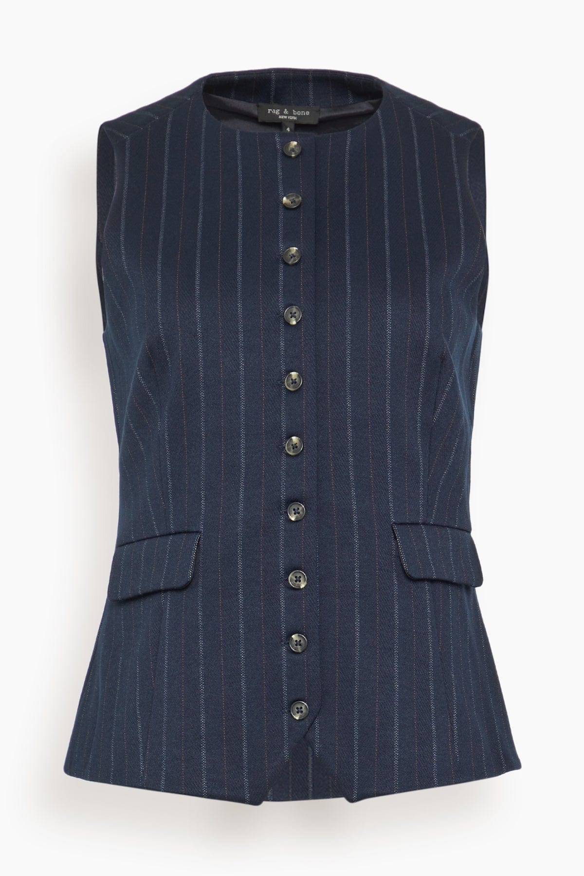 The Rag and Bone Irina Ponte Long Vest will easily take you from work out to drinks. This vest has a tailored silhouette with a streamlined button front in a stretch pinstripe material. Wear yours with the matching pants and loafers.