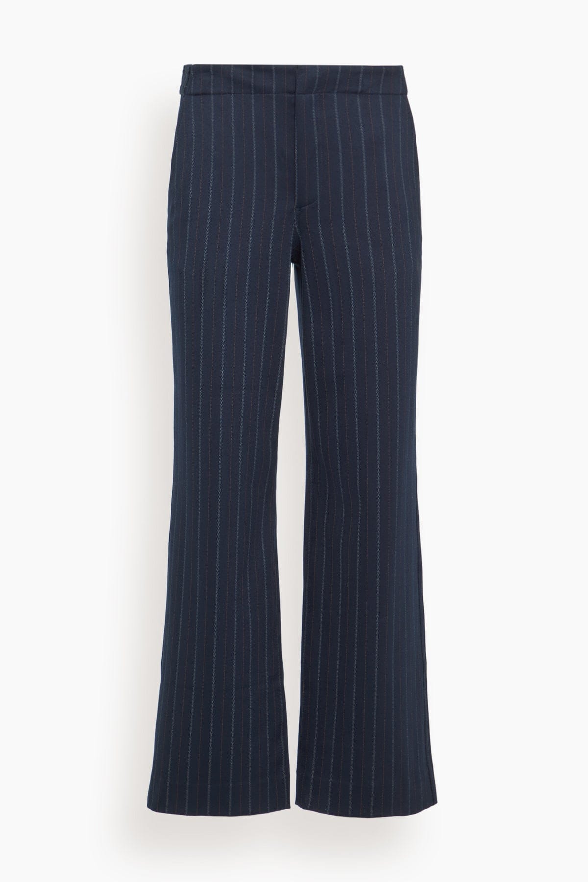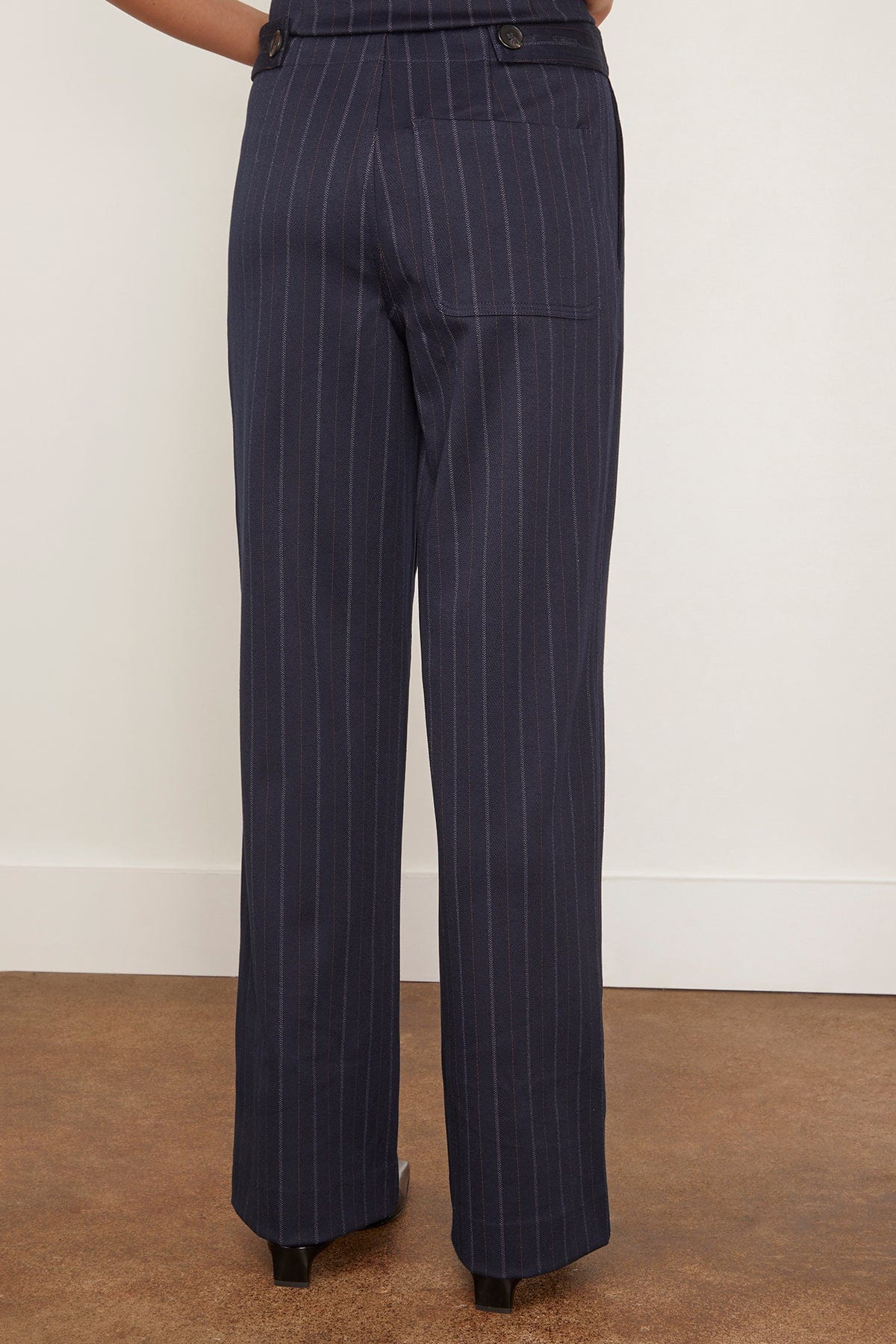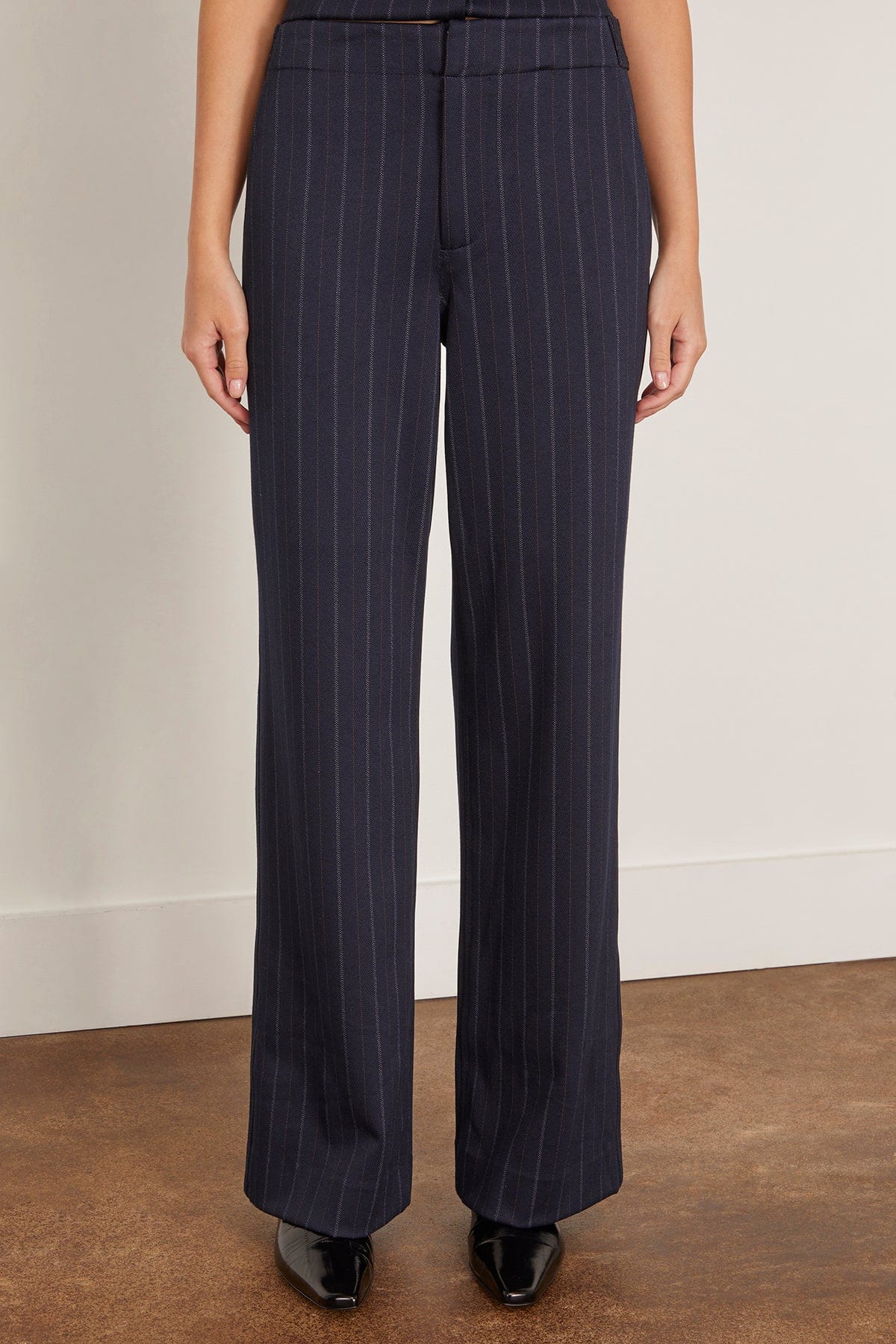 The Rag and Bone Irina Ponte Tailored Pant offer the perfect mix of tailored and relaxed. These pants are crafted in navy pinstripe with a wide leg and tab closure. Wear yours with a sweater and loafers.