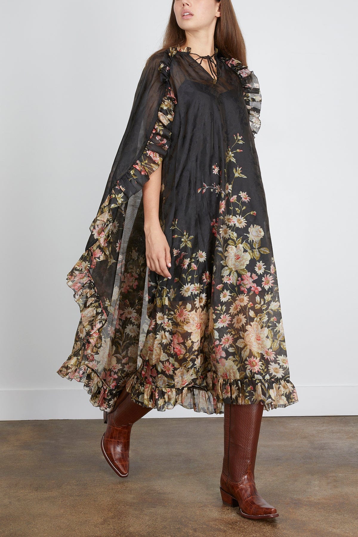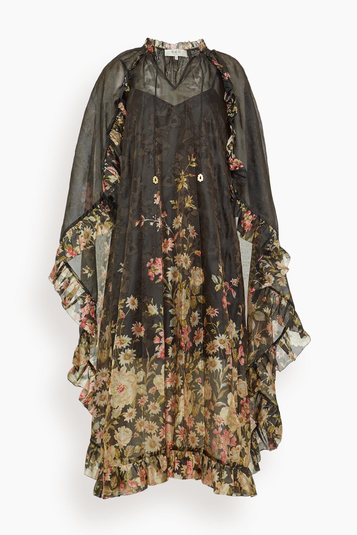 The SEA Jolie Print Caped Midi Dress is a standout piece from their Fall 25 Collection. This midi dress features a beautiful gradient floral print with intricate ruffle trim cape. Wear yours with boots and a clutch.