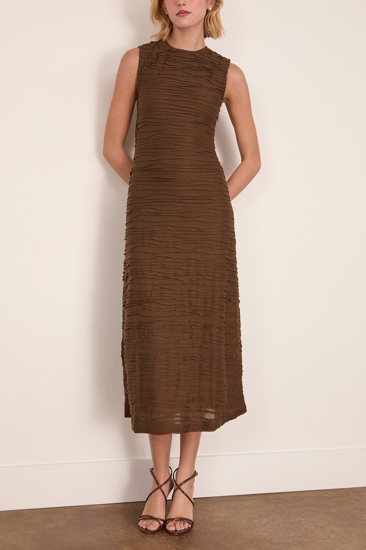 The Proenza Schouler Laura Dress in Textured Cotton Jersey is crafted with tuck detailing throughout. Designed with a crew neckline, cap sleeves, and three adjustable ties—including one at the waist that can be styled at the front or back.