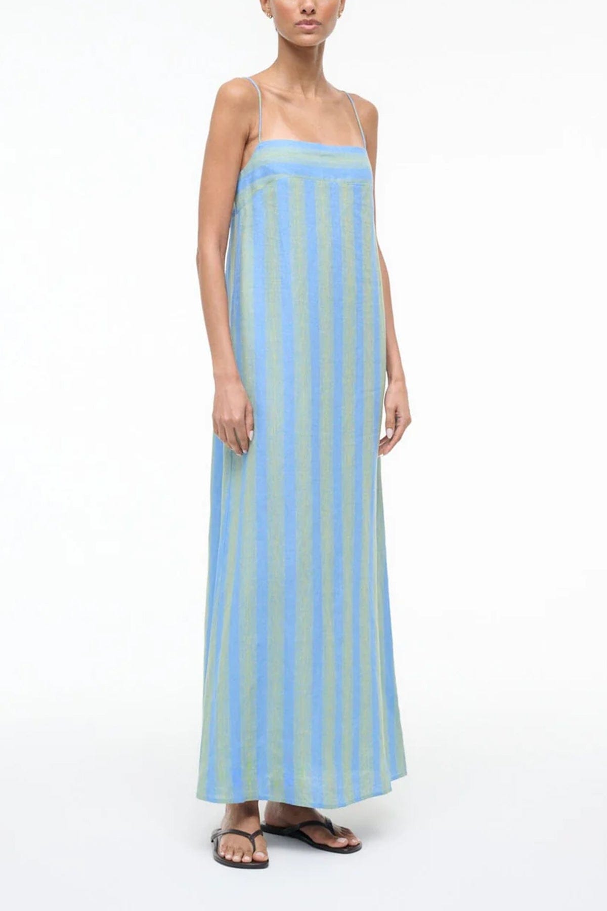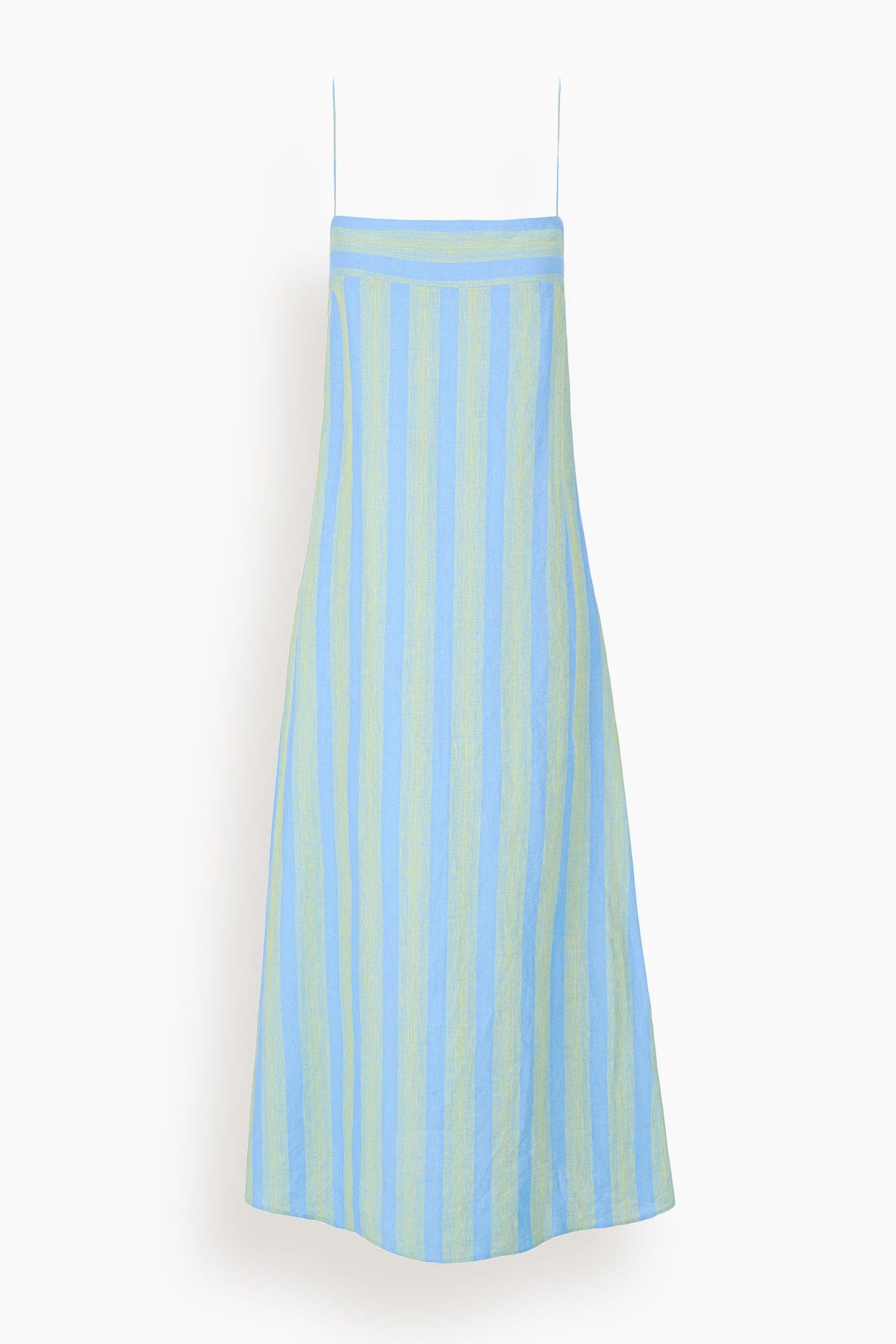The Staud Laura is back for the season, updated in a colorful striped linen pattern perfect for Spring. This style features a straight neckline and andjustable spaghetti straps.