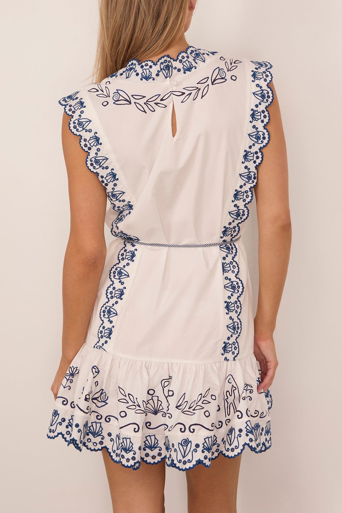 The Alemais Leela Embroidered Mini Dress in Cream is a sleeveless mini dress with embroidery and artwork created in collaboration with Laurence Leenaert.