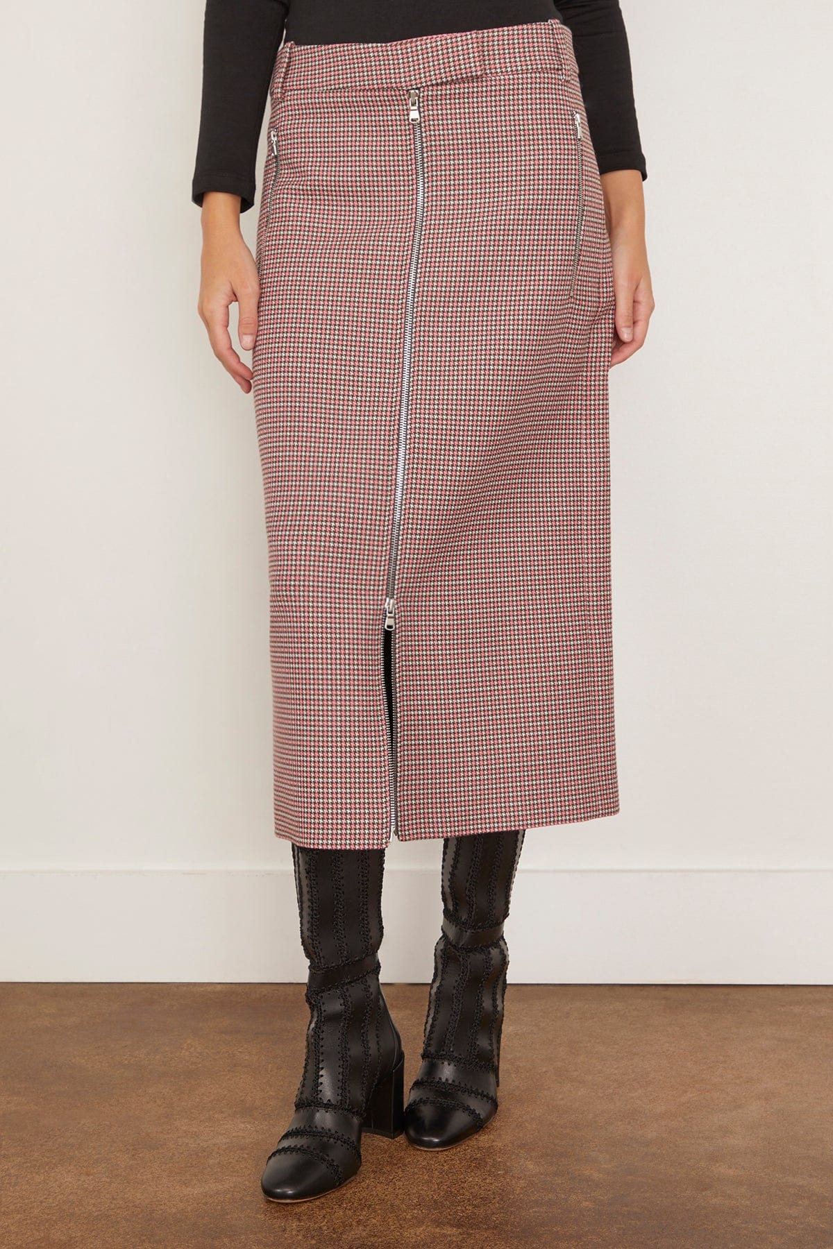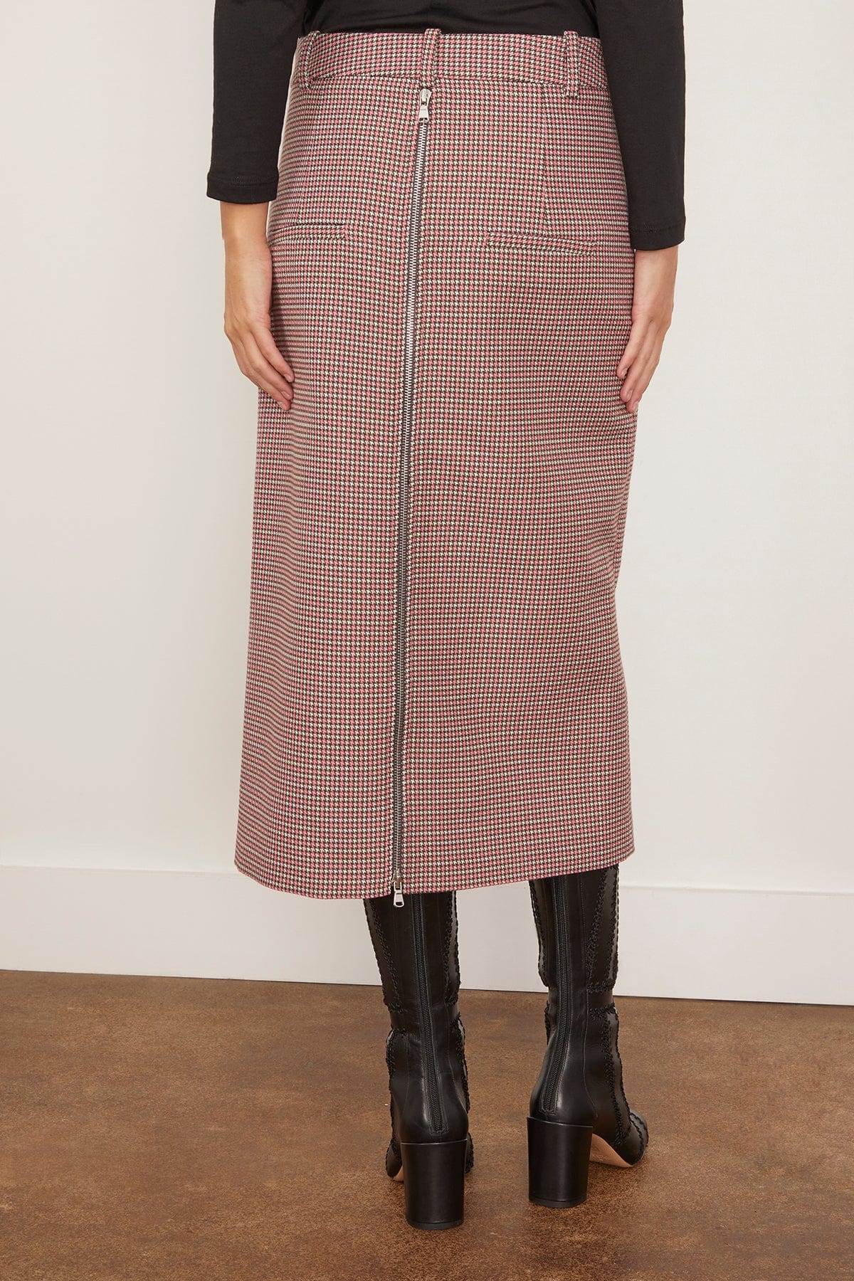 The Tibi Leon Check Midi Trouser Zip Skirt is a standout piece from their Fall 25 Collection. This midi skirt features a straight silhouette with a bold zip front and back in a virgin wool blend plaid. Wear yours with a sweater and boots.