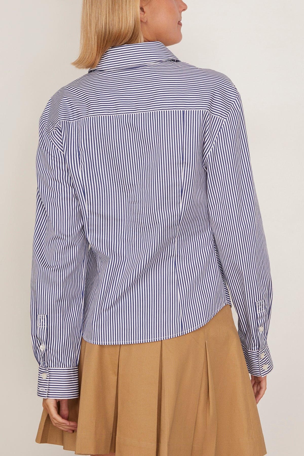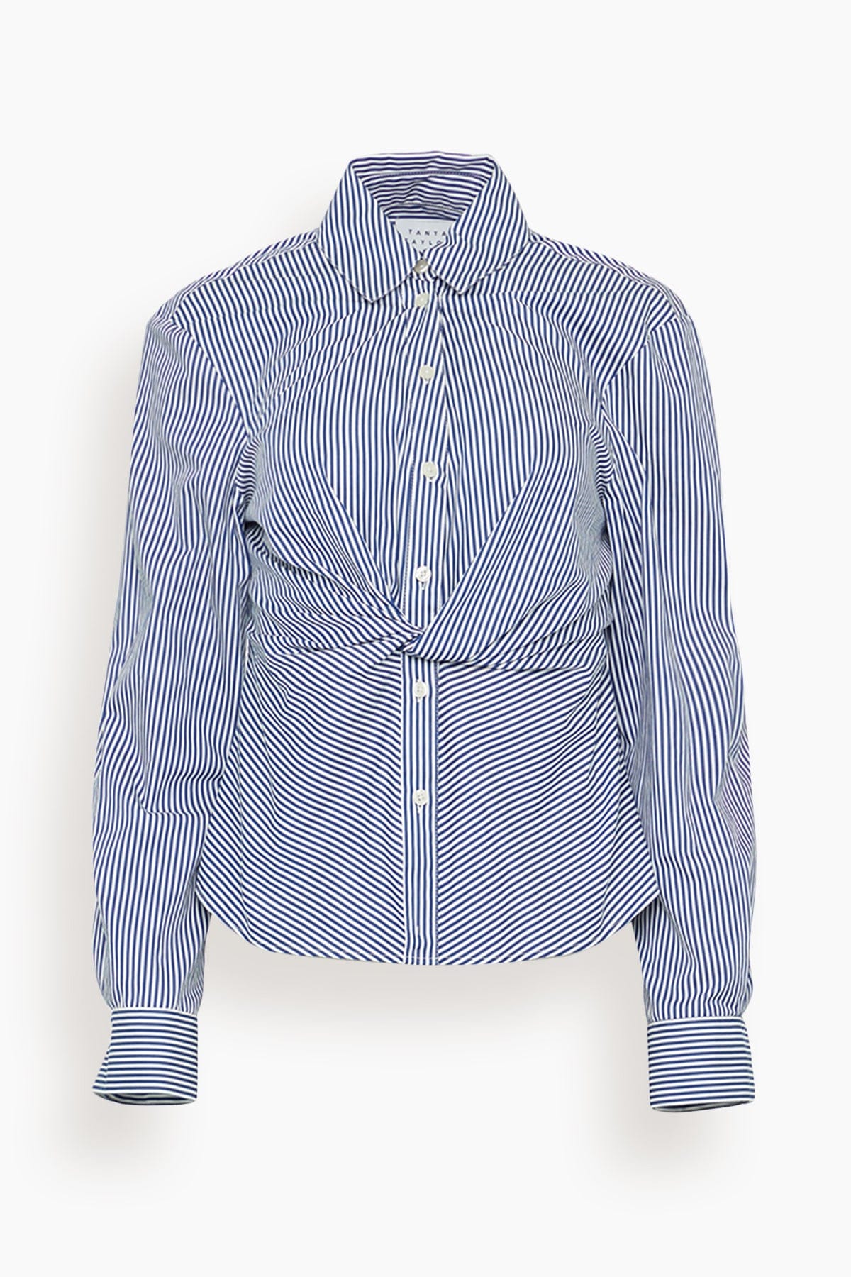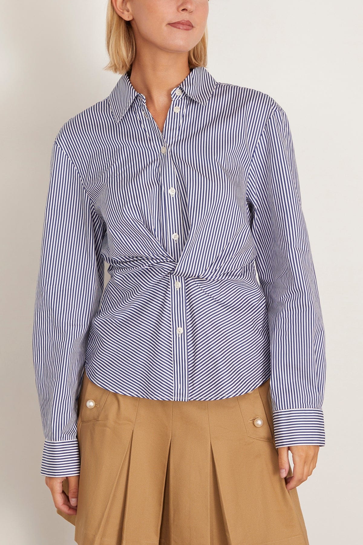 Back this Holiday season in a versatile stripe cotton shirting, the Tanya Taylor Long Sleeve Oakley Top is effortlessly chic and playful with a delicate collared neckline and a unique twist. Featuring a universally flattering center twist that cinches, Oakley elevates a classic button up for a novel look and feel.