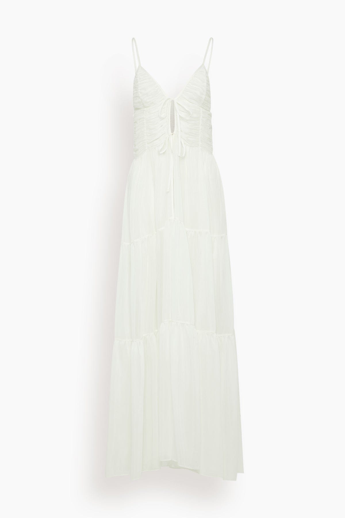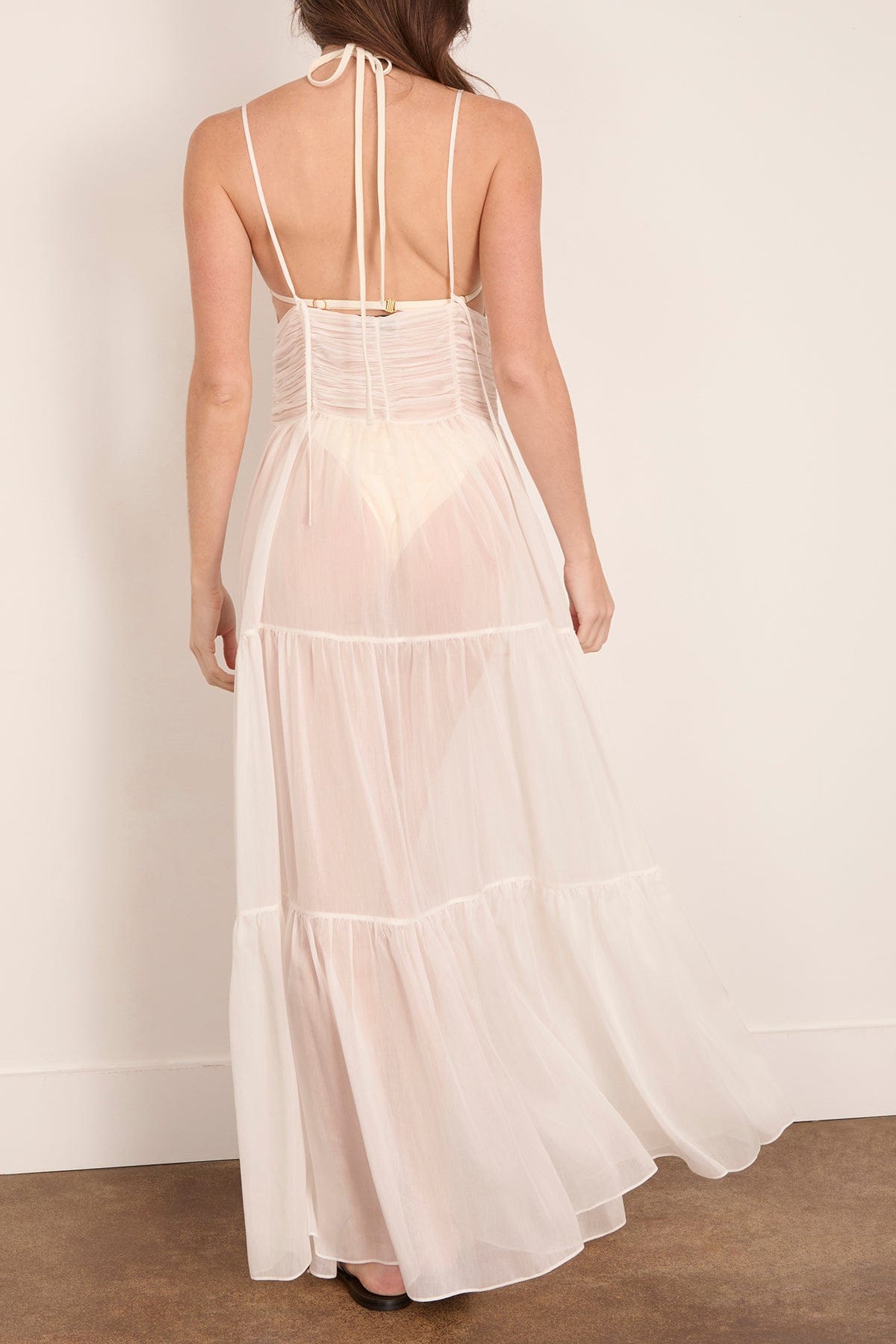 The More Noir Maeve Dress will have you ready for warm weather vacation. This midi dress features a tiered, gauzy skirt with a triangle top in a lightweight cotton and silk blend. Wear yours with sandals and a tote bag.