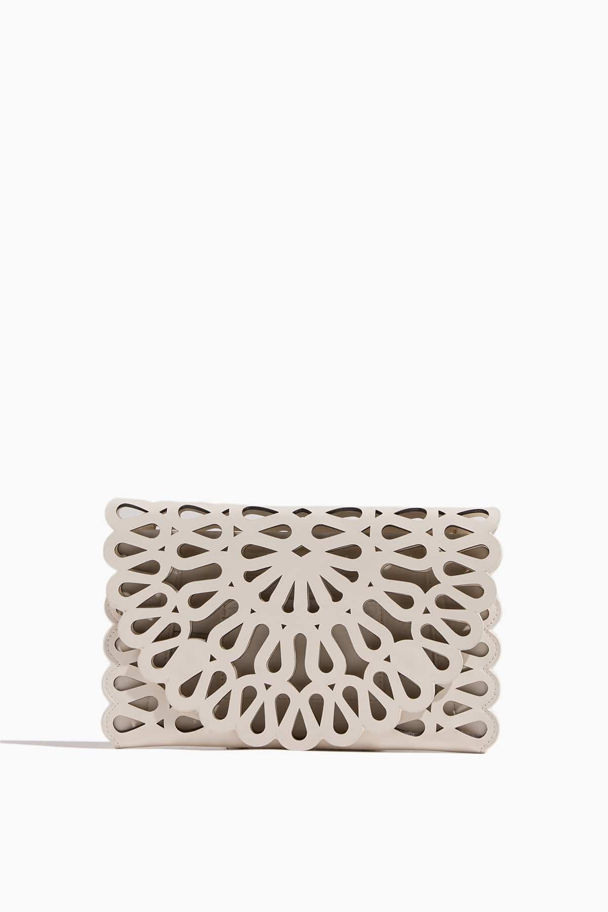 The Simkhai Mccall Laser Cut Leather Clutch is a beautiful piece from their Resort 26 Collection. This clutch features laser leather cutouts with a flap closure.