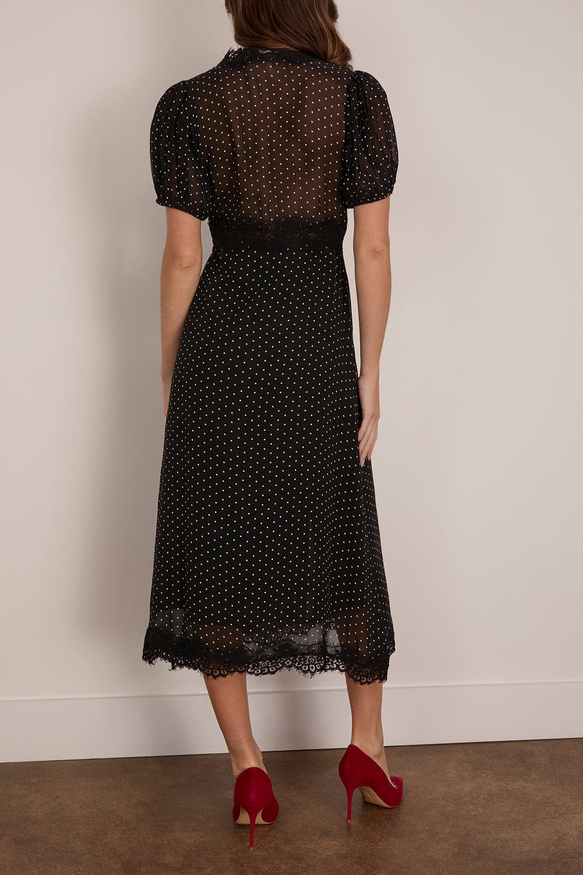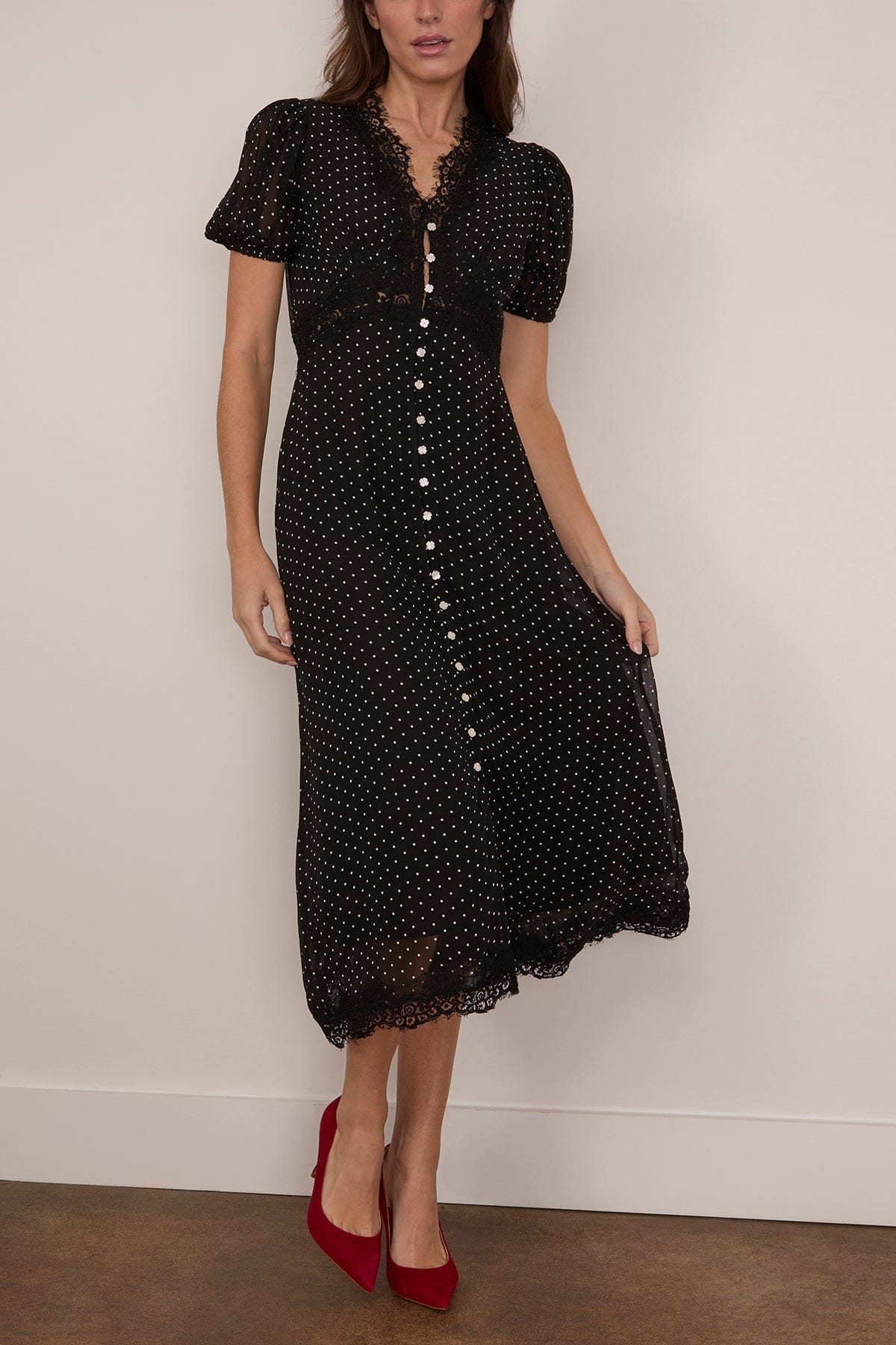 The SEA Melody Polka Dot Puff Sleeve Dress has a vintage inspired look you'll love. This polka dot has lace details with puffed sleeves and a button front. Wear yours with boots and a shoulder bag.