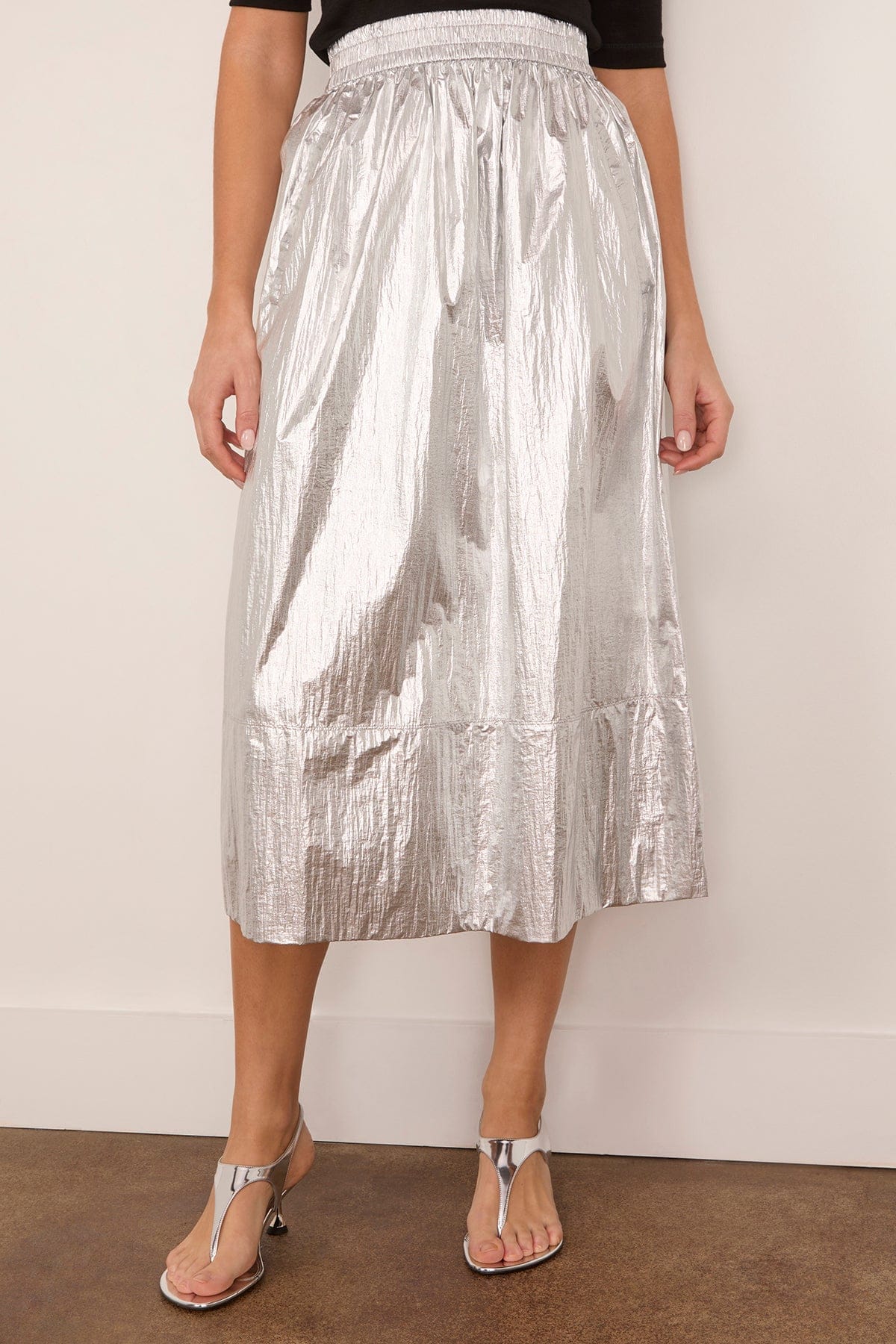 The Tibi Metallic Nylon Pull On Full Skirt is a playful piece from their Resort 26 Collection. This midi skirt is crafted in a metallic nylon with a relaxed silhouette that can easily be worn day or night. We love it paired with a sweater and flats.