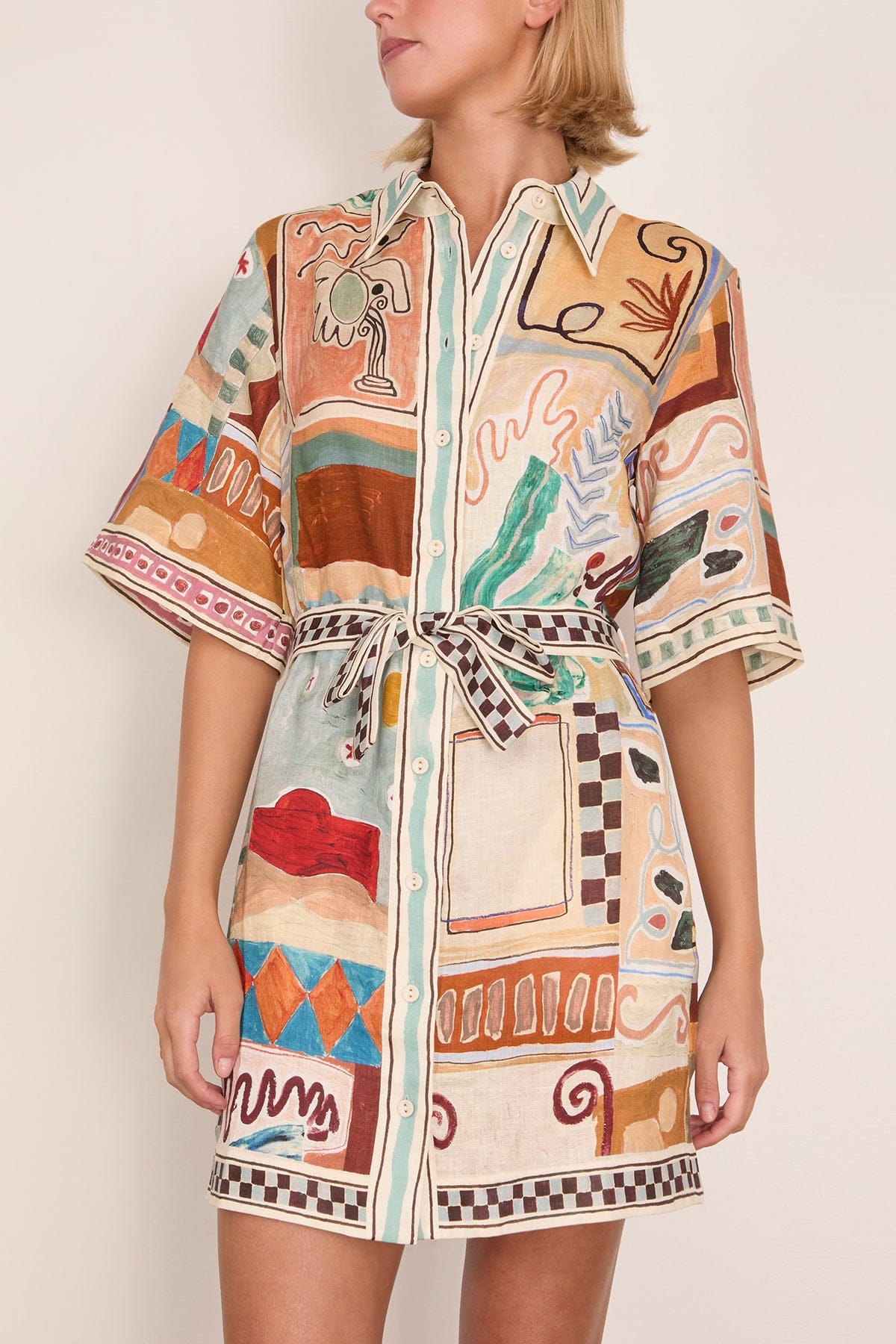 The Alemais Michelle Mini Dress in Multi is a short sleeve shirtdress with print created in collaboration with Laurence Leenaert.
