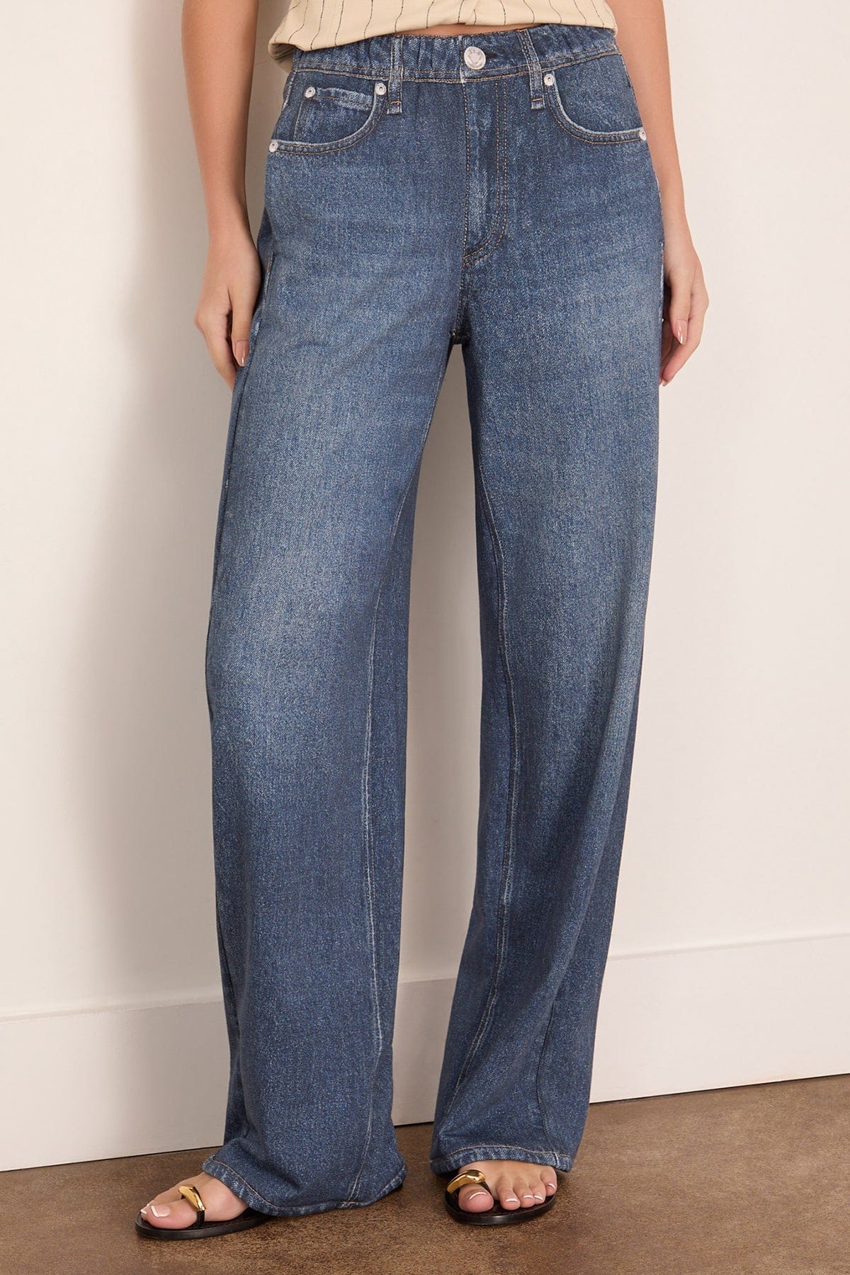 The Rag and Bone Miramar Terry Wide Leg Pant features their signature silhouette. These jeans mimic your favorite sweatpants in soft denim with a wide leg and elastic waistband. Wear yours with a button down and flats.