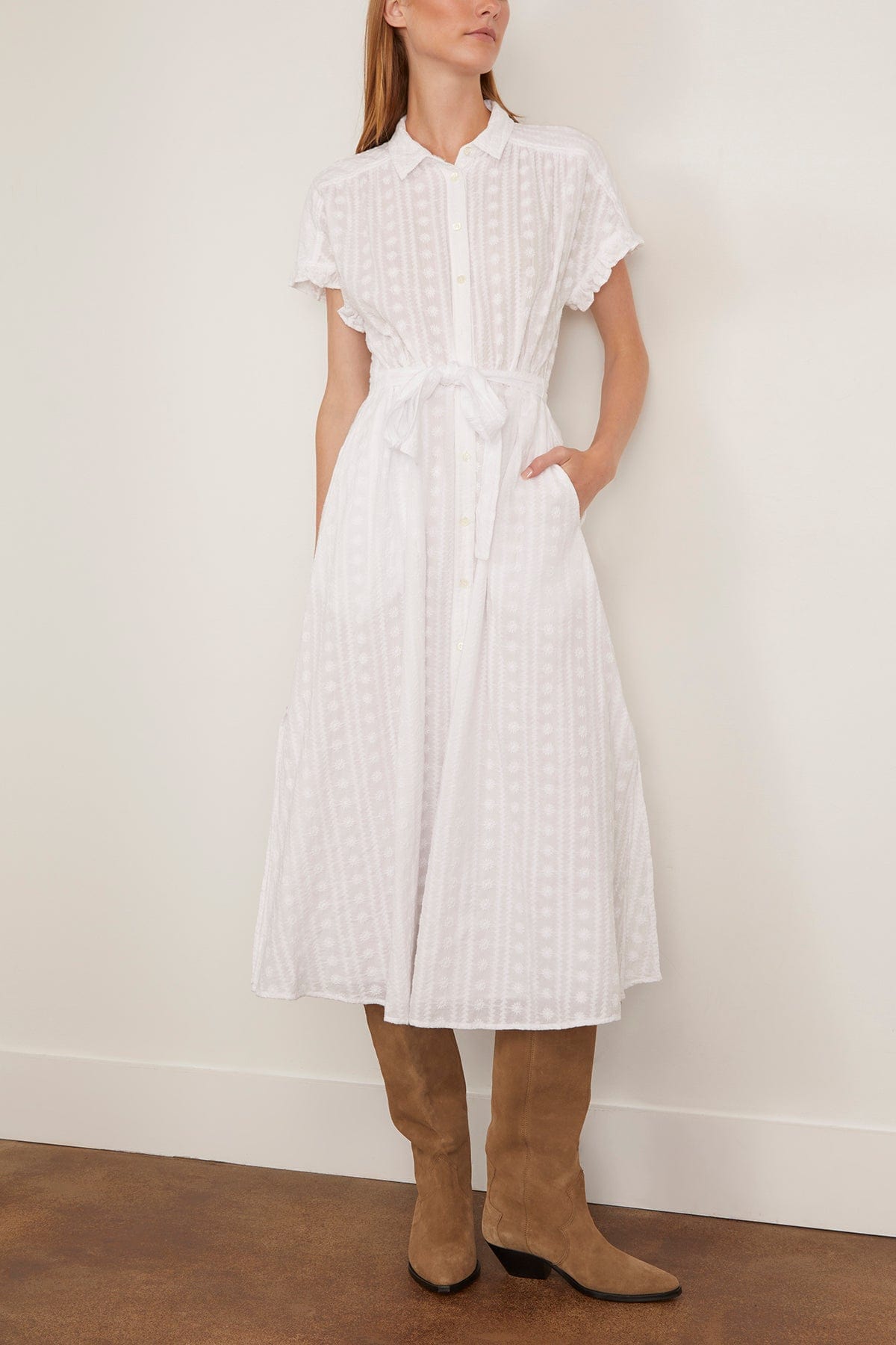 The Xirena Naya Dress features beautiful floral embroidery. You'll love the relaxed fit of this shirtdress with a self tie belt. Wear yours with sandals and a shoulder bag.