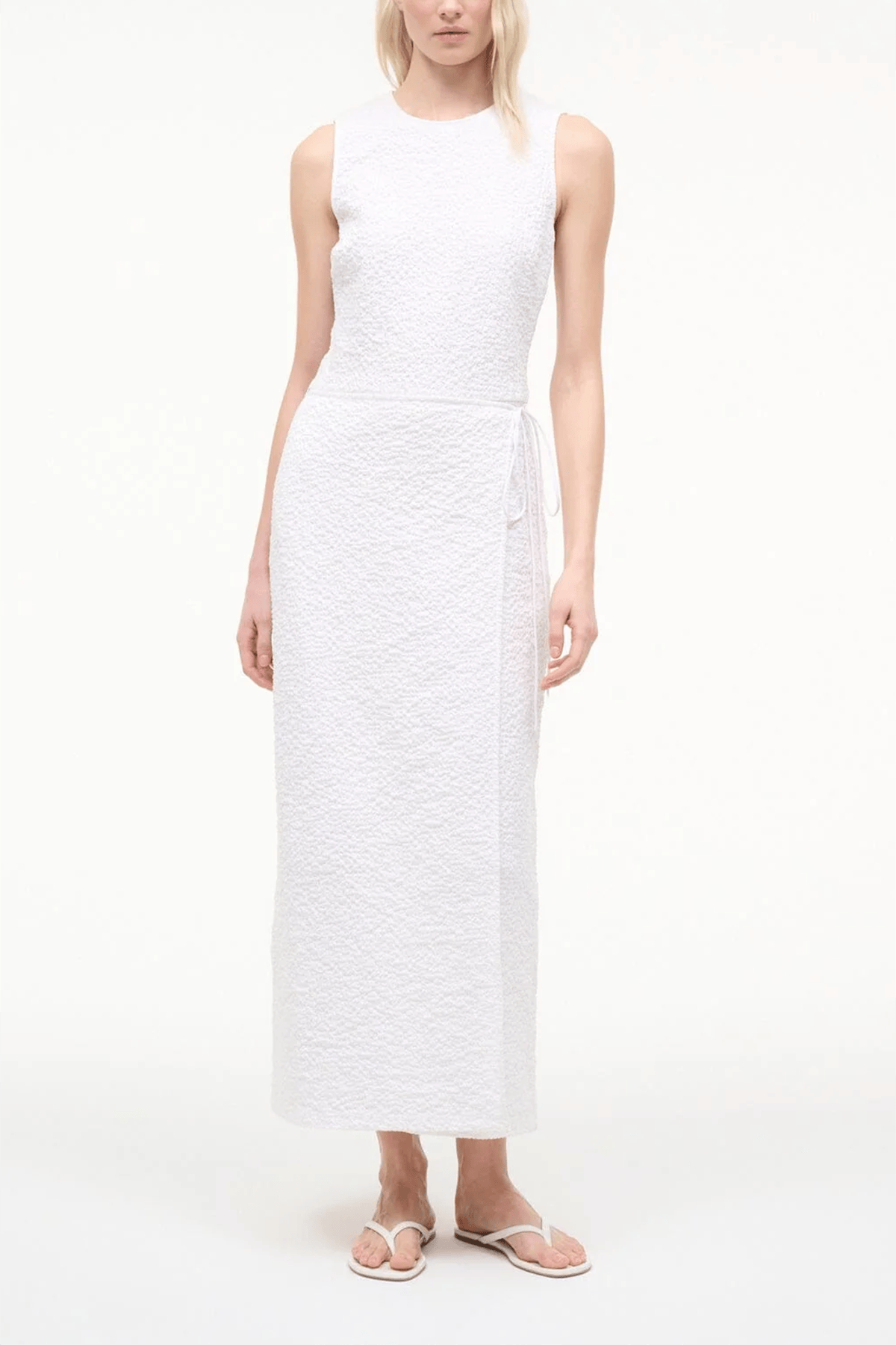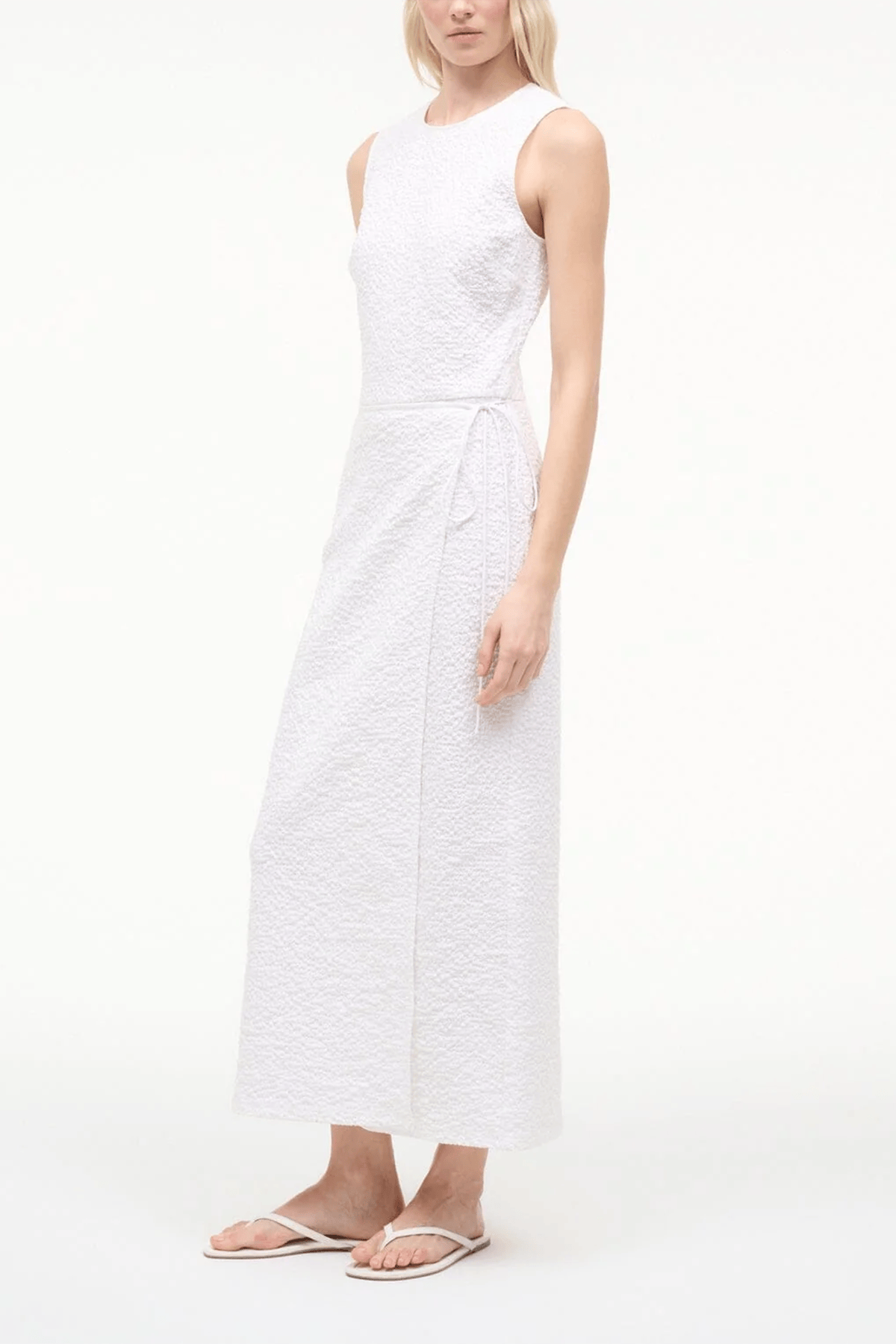 The Staud Nema is a smocked cotton dress with a wrap skirt, center back zip closure and adjustable waist ties.