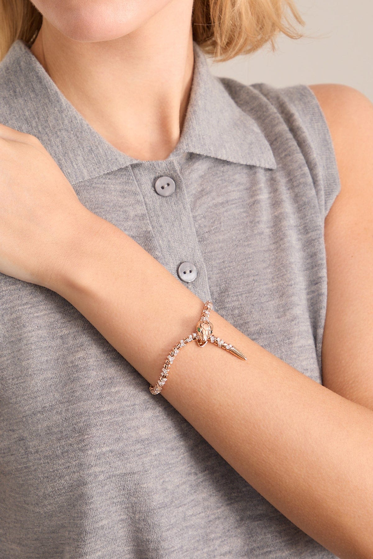The Stoned Fine Jewelry Nouveau Scattered Diamond Serpent Bracelet is a must-have piece from this designer. This necklace features a beautiful serpent shape with tsavorite eyes and diamond details.