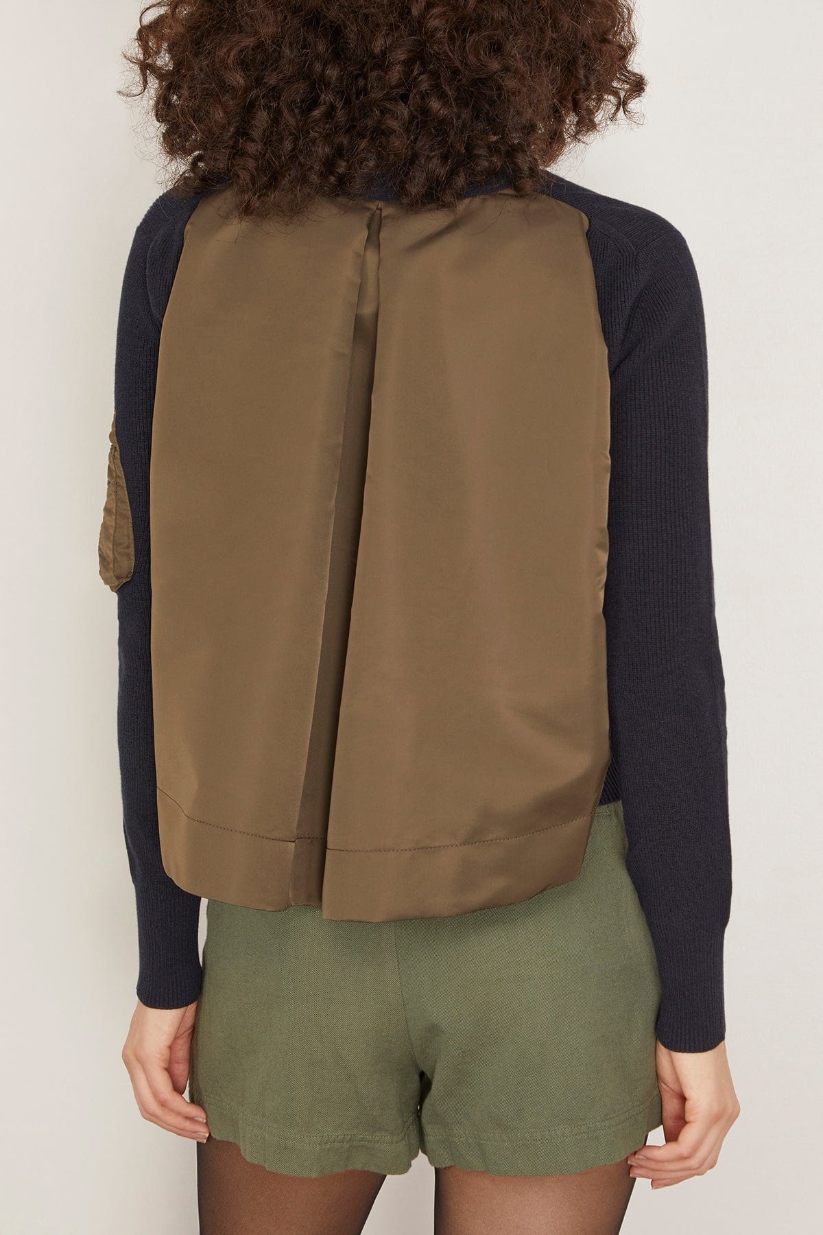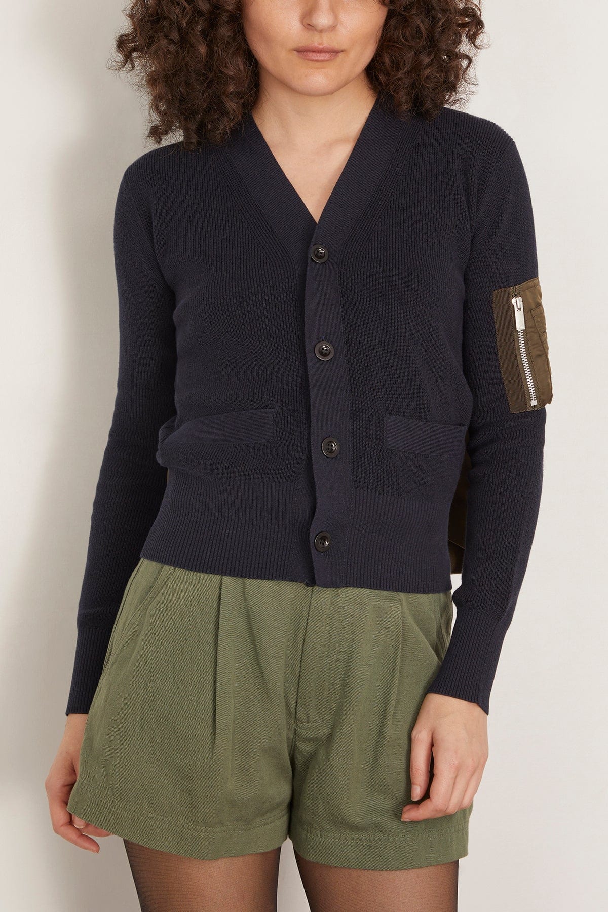 The Sacai Nylon Twill Cotton Knit Cardigan features the unique details you love from this designer. This cardigan has a relaxed fit with cargo details and a nylon back.