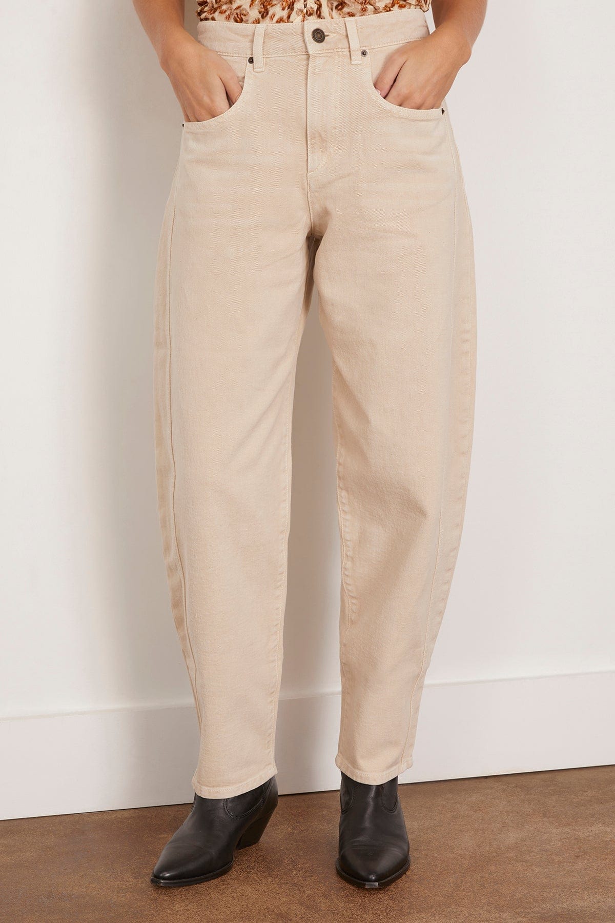 The Isabel Marant Oriane Jean is an on-trend addition to your wardrobe. This jeans feature a barrel leg with a high rise and slouchy fit. Wear yours with a blouse and boots.