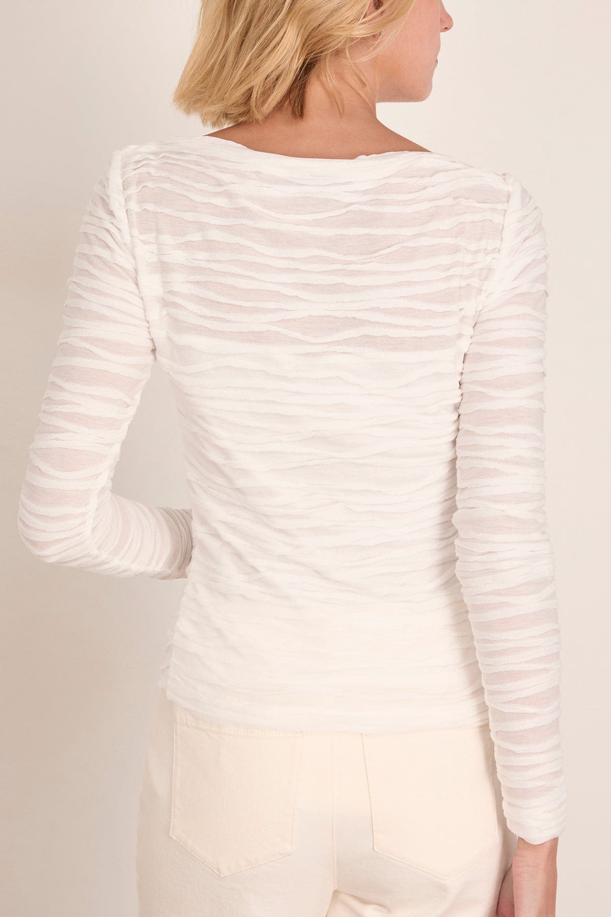 The Proenza Schouler Paloma Top in White Textured Cotton features a boat neckline and a sheer panel above the bust, with lining from the bust down. Detailed with tuck detailing throughout.
