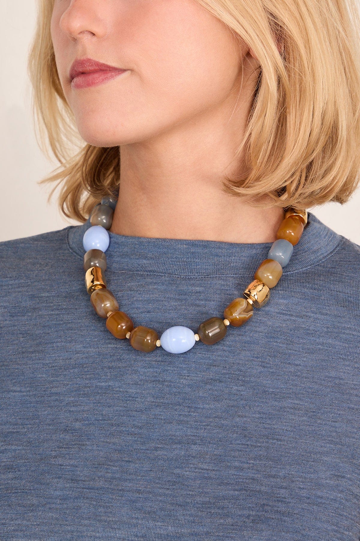The Lizzie Fortunato Palomino Necklace will be a standout piece in your jewelry collection. This necklace features an array Tibetan agate, angelite, and mother-of-pearl.