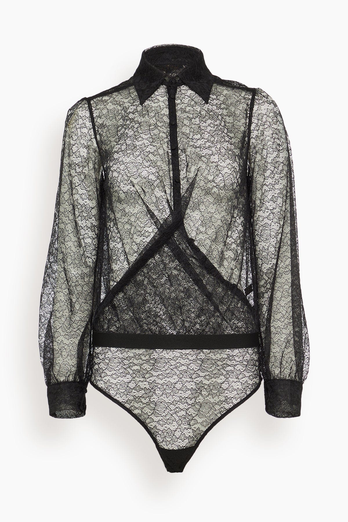 The Kiki de Montparnasse Petite Fleur Crossover Bodysuit in Black adds the provocative, statement-making allure of lace to any look. This collared bodysuit features a draped crossover front and button cuffs. The fit is soft, sculpting, and endlessly flattering--perfect on its own or layered for a look that feels both modern and irresistibly alluring.