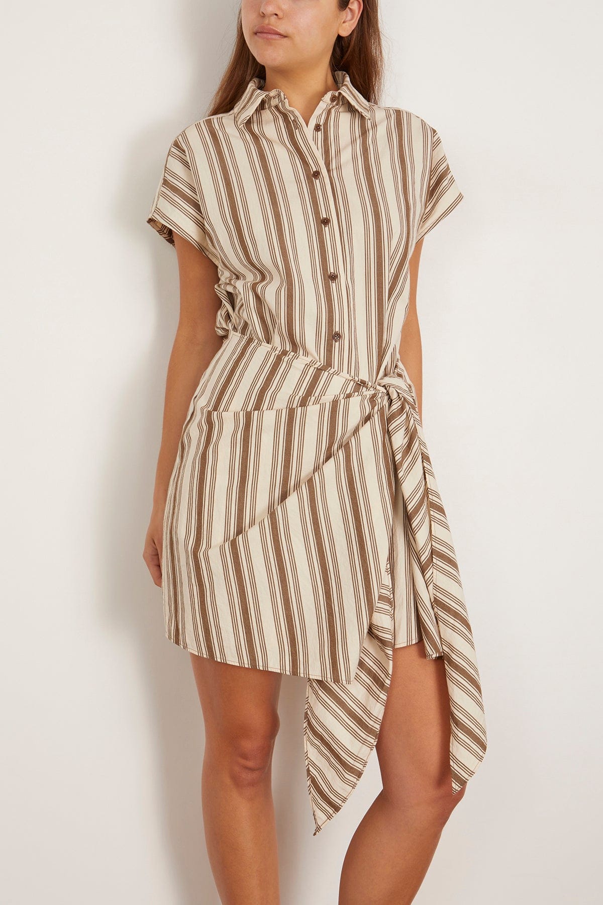 The Apiece Apart San Vito Sarong Dress in Wide Stripes Coffee and Creami an easy mini designed with a cool wrap for a flattering fit.