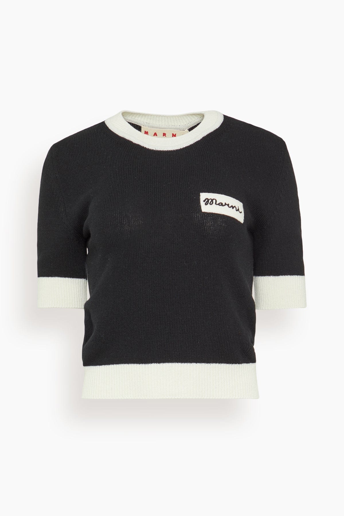 The Marni Short Sleeve Crewneck Sweater is a must-have piece from their Resort 26 Collection. This short sleeve sweater is crafted in a wool blend with the marni logo stitched across the chest. Wear yours with a skirt and loafers.
