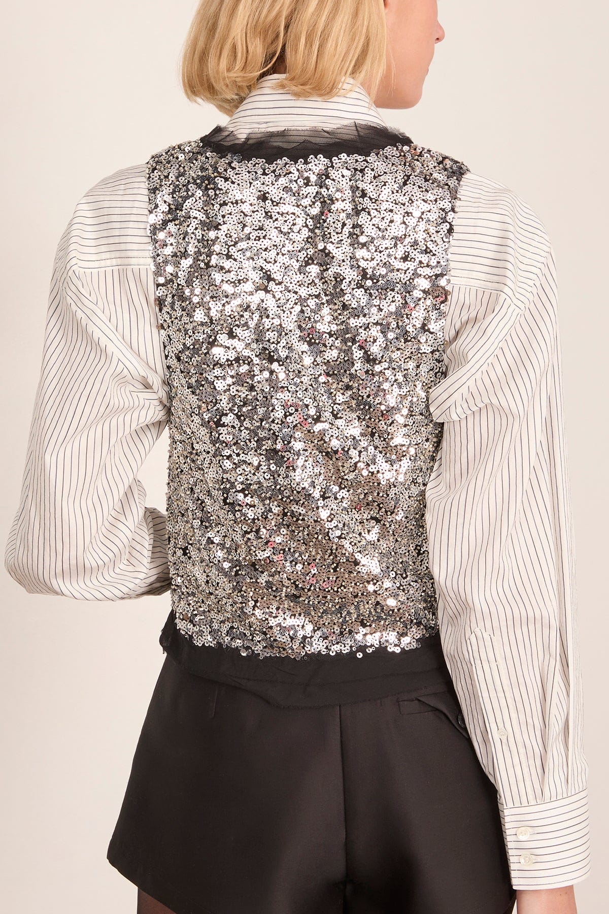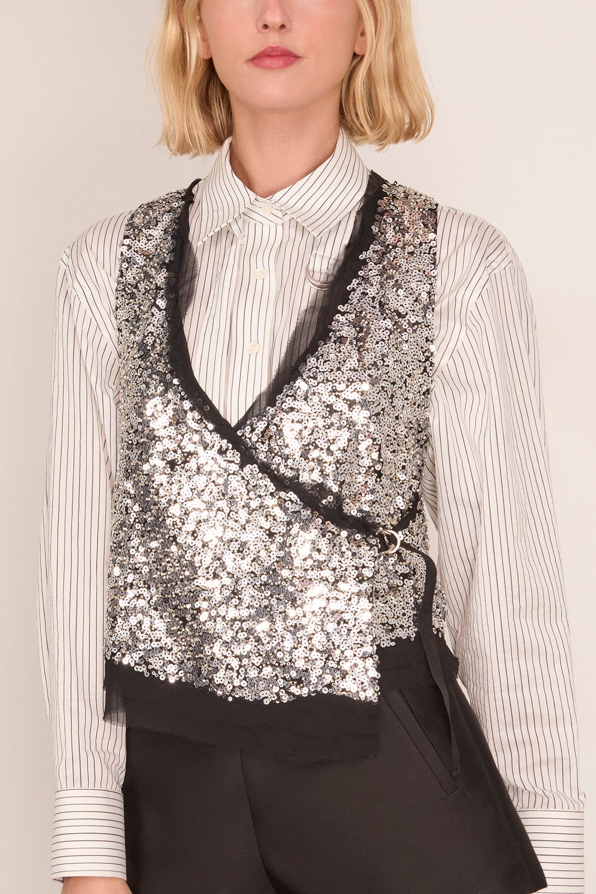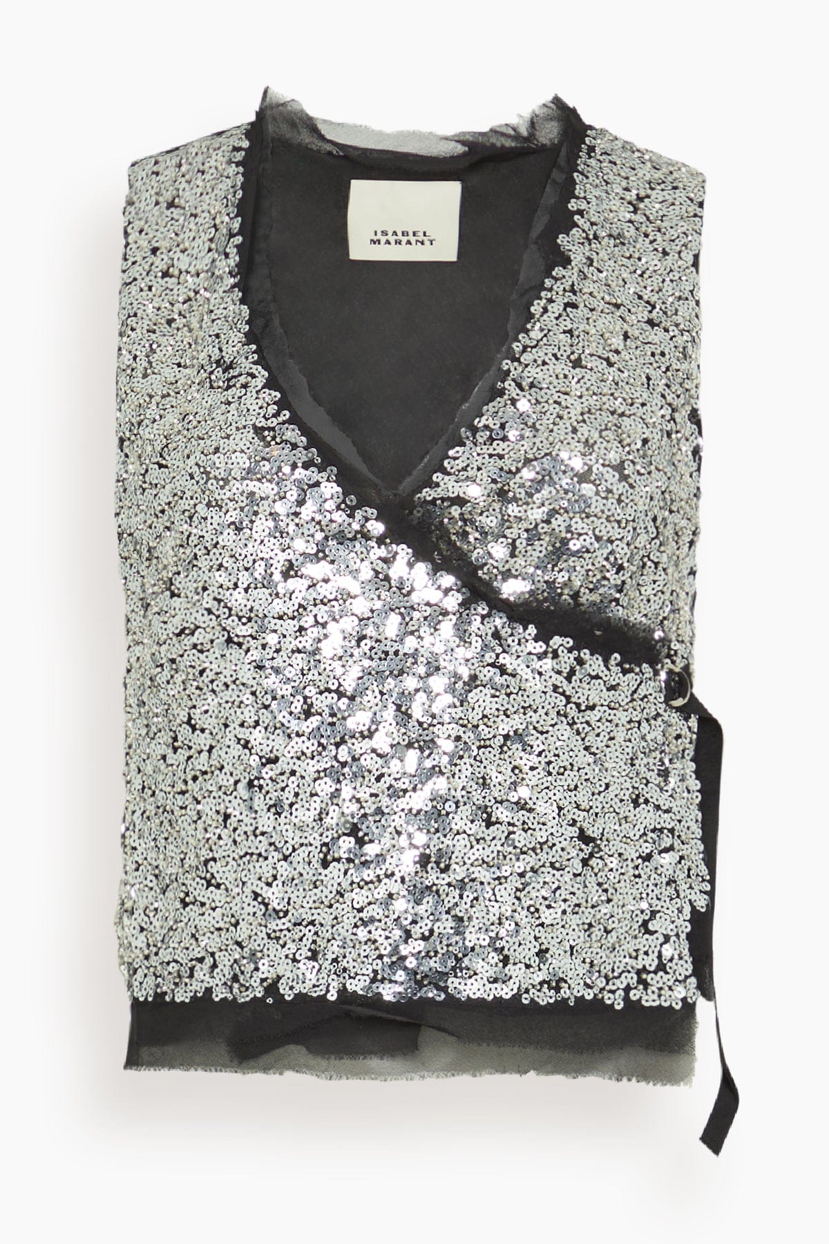 The Isabel Marant Tahina Top is a standout piece from their Fall 25 Collection. This vest features allover sequins with a crossover closure. Wear yours with jeans and boots.