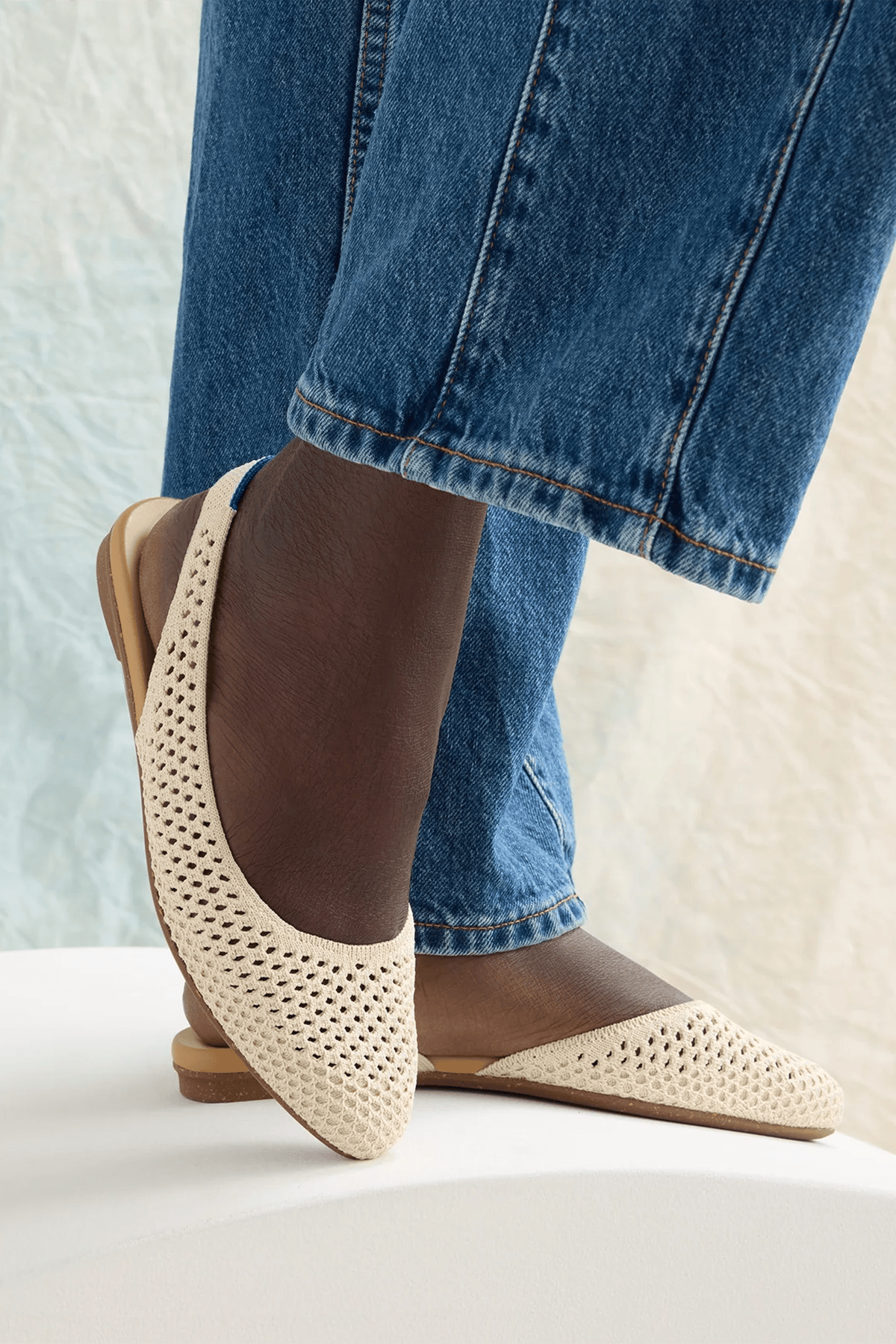 The Rothy's The Almond Slingback in Off White Mesh features an airy, mesh upper in ivory, with their signature almond toe.