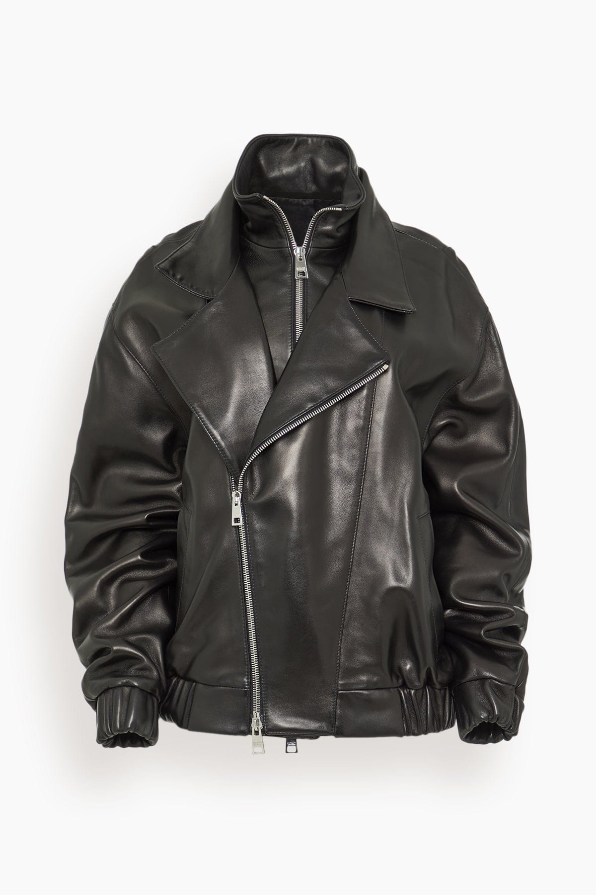 Cut from supple lamb leather, the Brandon Maxwell The Emmett Double Zip Leather Moto Jacket in Black redefines the classic moto silhouette with a modern, sculptural edge. Strong lapels and exposed two-way zippers add industrial sharpness and versatile styling options, balanced by the soft drape and natural sheen of the leather. Elasticated hems at the cuffs and waist lend subtle structure, while meticulous topstitching highlights its craftsmanship. Both refined and enduring, it’s designed to live in your wardrobe forever.