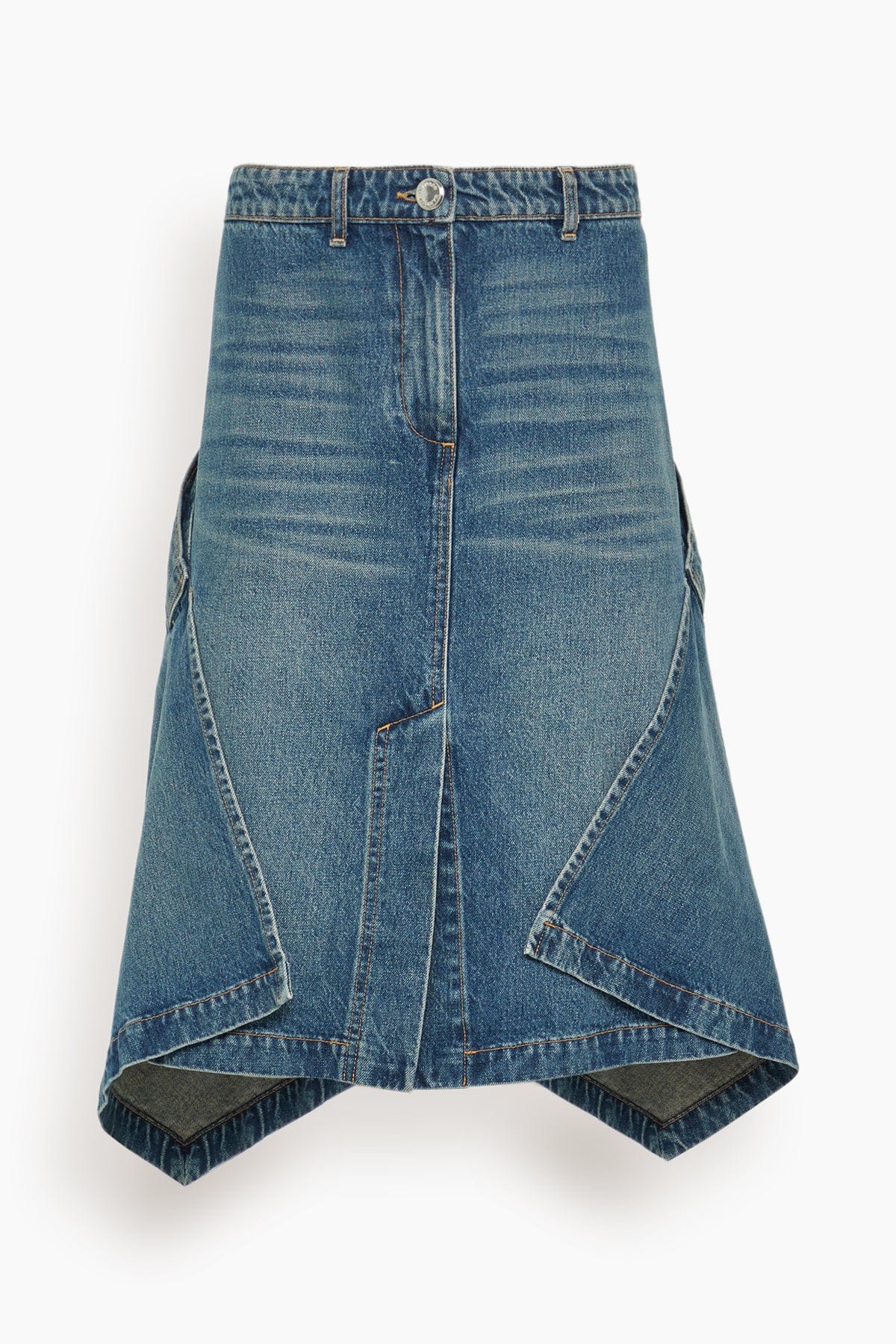 Crafted from premium denim in a vintage-inspired Dakota wash, The Brandon Maxwell Frankie Skirt redefines a wardrobe staple with sculptural precision. Its asymmetrical cascade hem creates architectural movement, while the high-rise waist and paneled construction accentuate the form with modern ease. Finished with signature topstitching and a branded leather logo patch, it brings an elevated perspective to classic American denim.