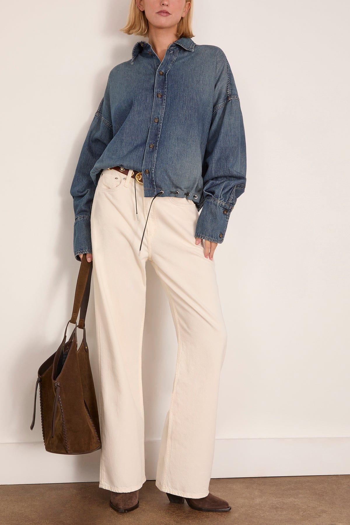 Crafted from 100% cotton denim in a rich Dakota wash, this shirt reimagines classic workwear through a sculptural lens. Sharp pleats and pintucks are secured with sleek silver grommets, each hand-applied for subtle dimension and craftsmanship. The relaxed silhouette is finished with a crisp point collar, elongated cuffs and a leather cord threaded through the front eyelets for a refined utilitarian touch. Balancing structure and softness, it embodies modern sophistication in its most effortless form.