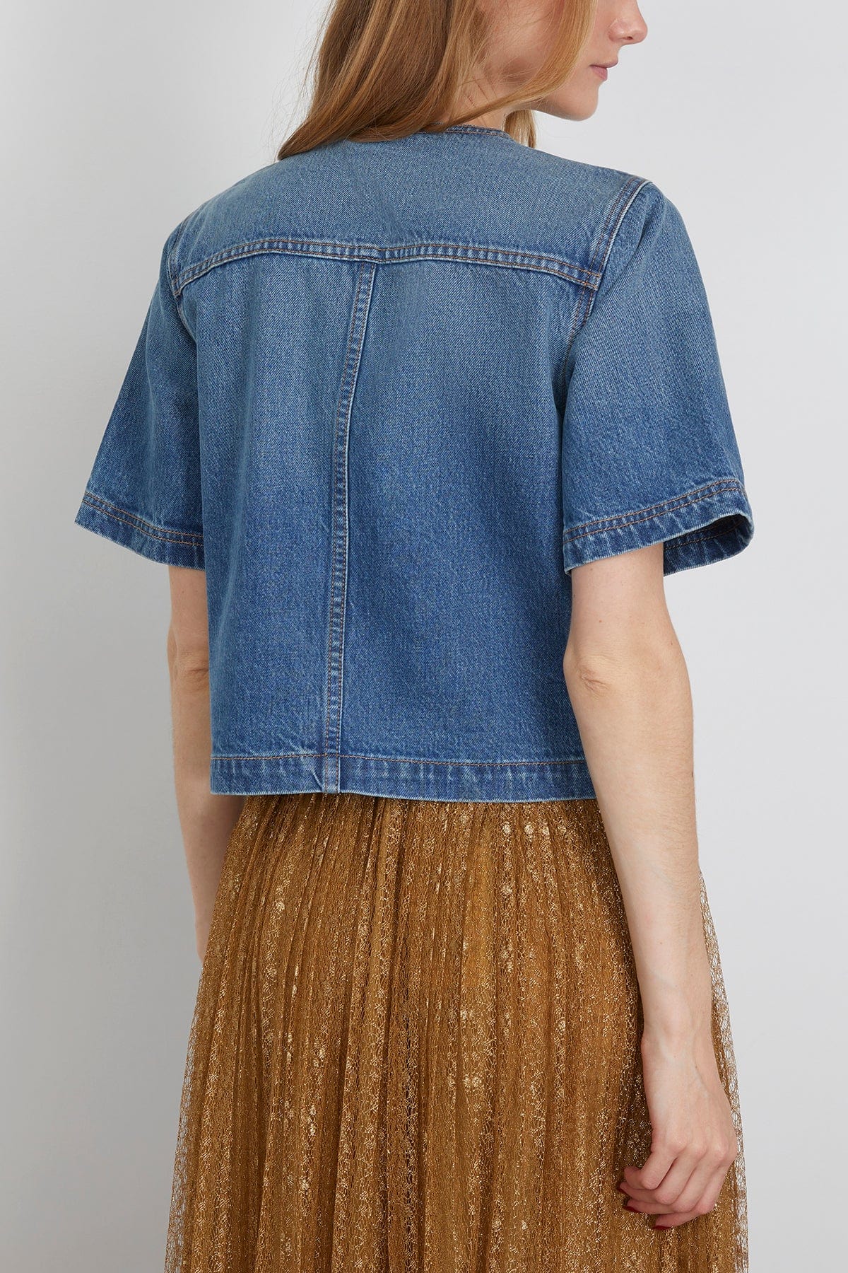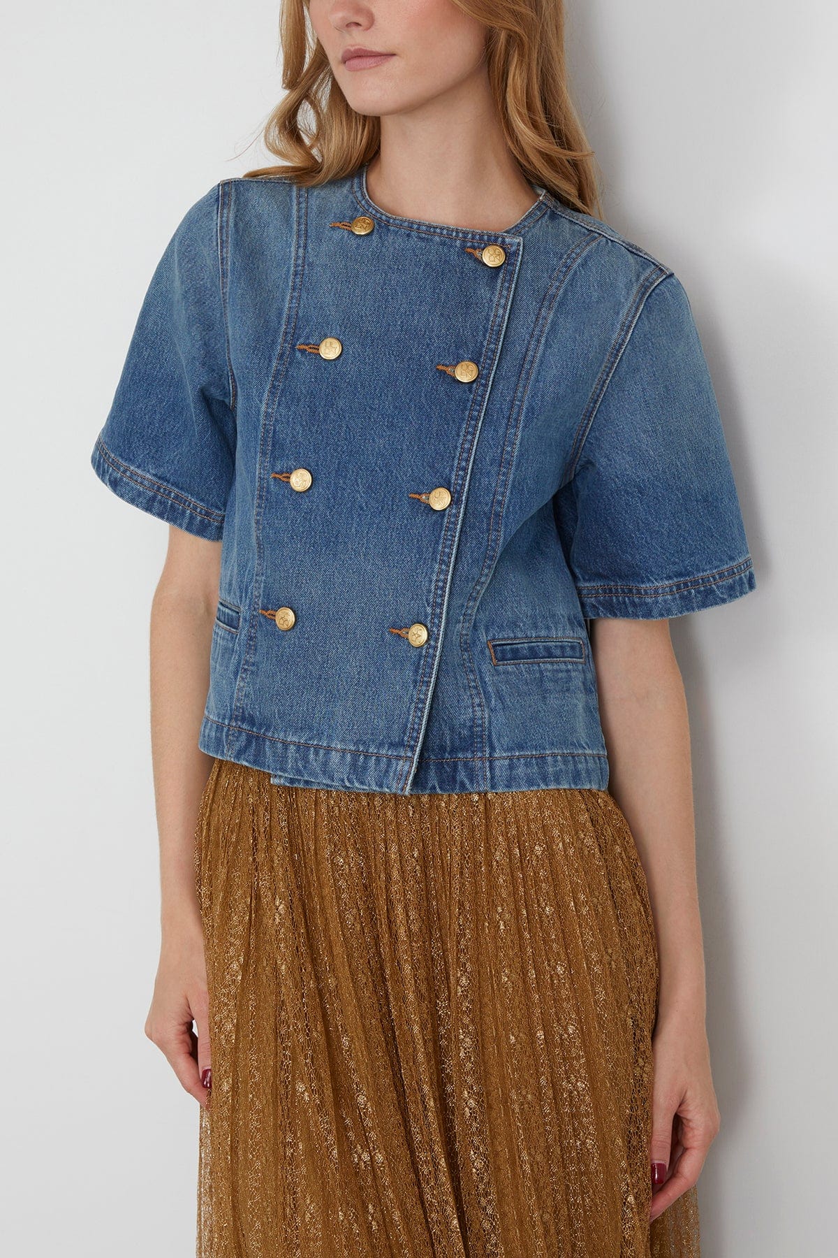 The Ulla Johnson The Serge Short Sleeve Jacket is a must-have piece from their PreFall 25 Collection. This short sleeve denim jacket features a boxy silhouette and double breasted closure that mimics a lady jacket. Wear yours with trousers and flats.