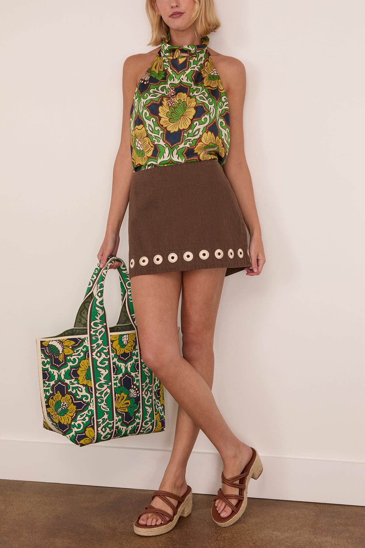 The Alemais Tobe Denim Skirt in Chocolate is a fitted mini skirt silhouette with eyelet detail.